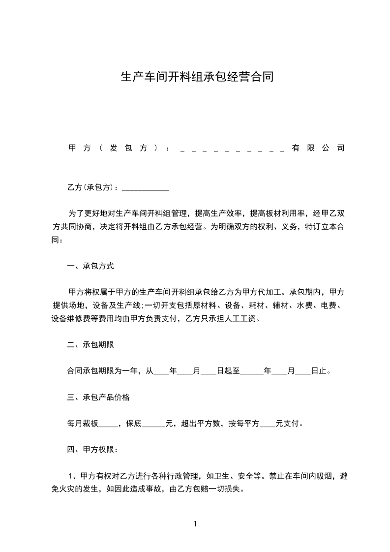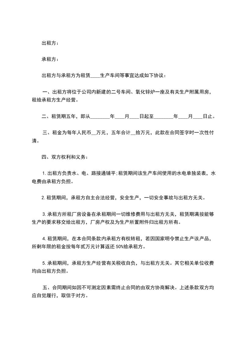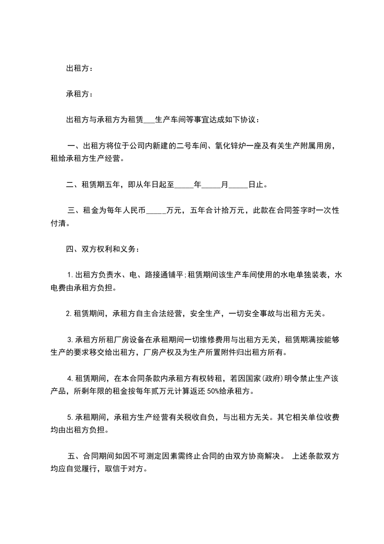 一、出租方将位于公司内新建的二号车间、氧化锌炉一座及有关生产附属用房,租给承租方生产经营。