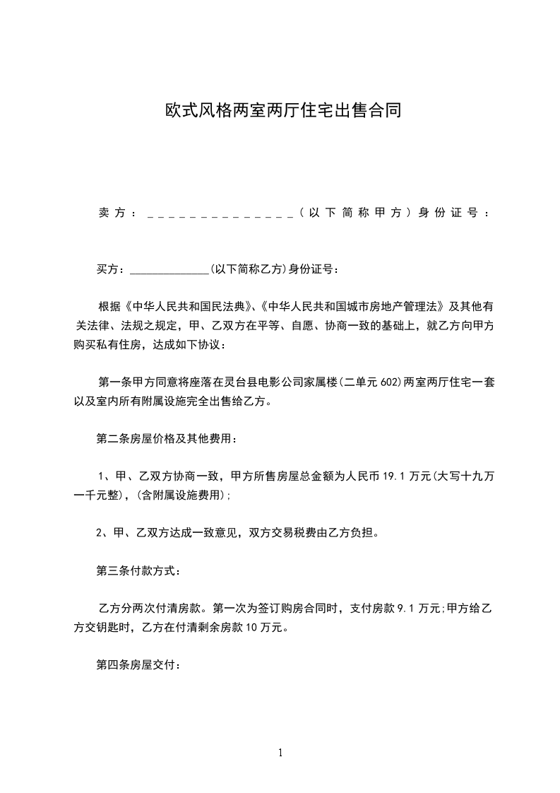第一条甲方同意将座落在灵台县电影公司家属楼(二单元602)两室两厅住宅一套以及室内所有附属设施完全出售给乙方。