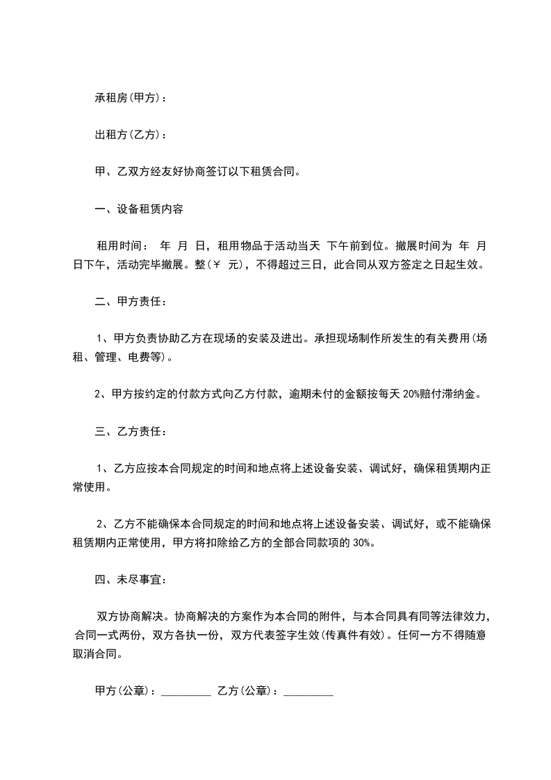 租用时间: 年 月 日,租用物品于活动当天 下午前到位。撤展时间为 年 月 日下午,活动完毕撤展。整(¥ 元),不得超过三日,此合同从双方签定之日起生效。
