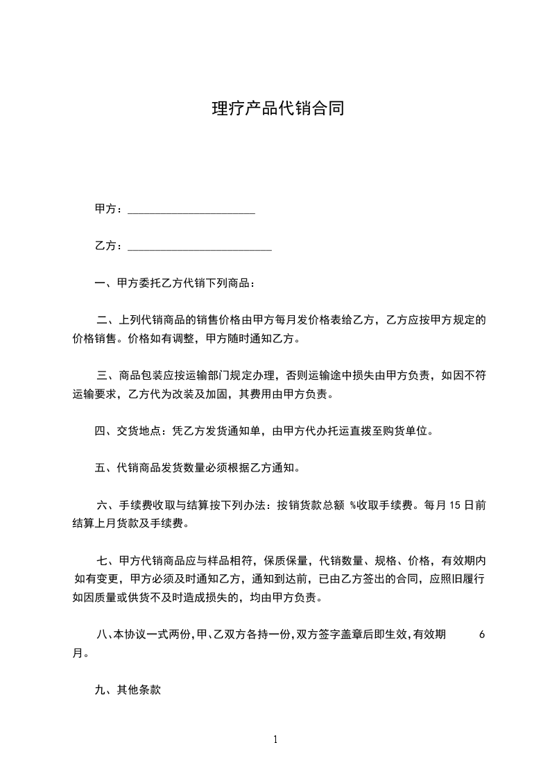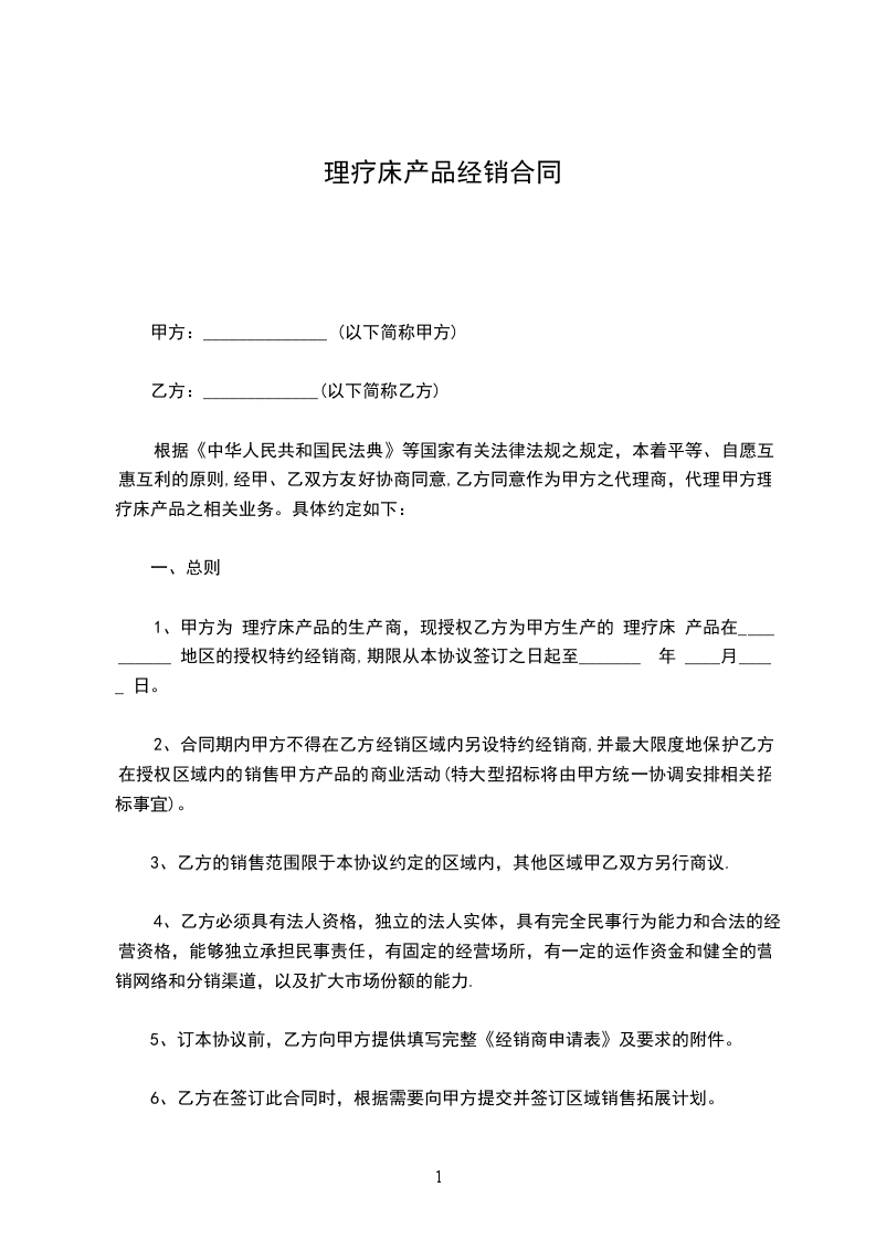 1、甲方为 理疗床产品的生产商,现授权乙方为甲方生产的 理疗床 产品在__________ 地区的授权特约经销商,期限从本协议签订之日起至_______ 年 ____月_____ 日。