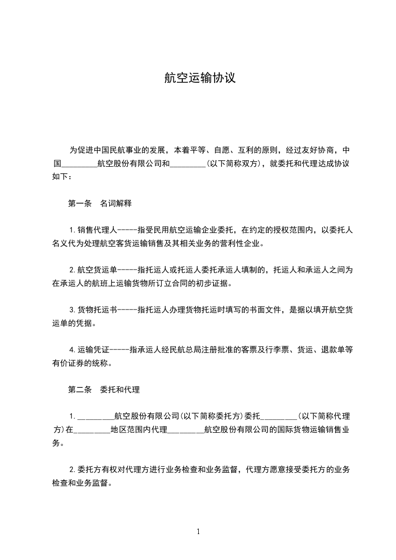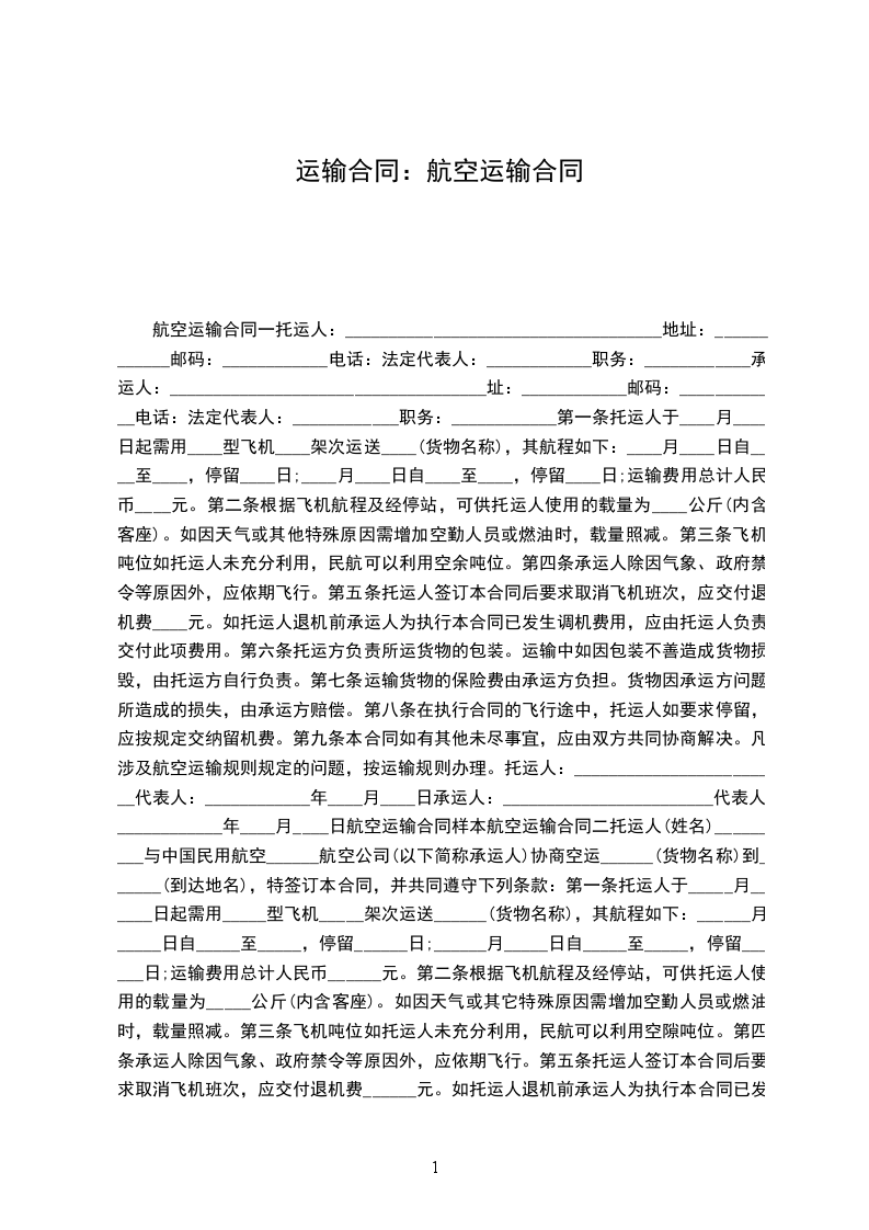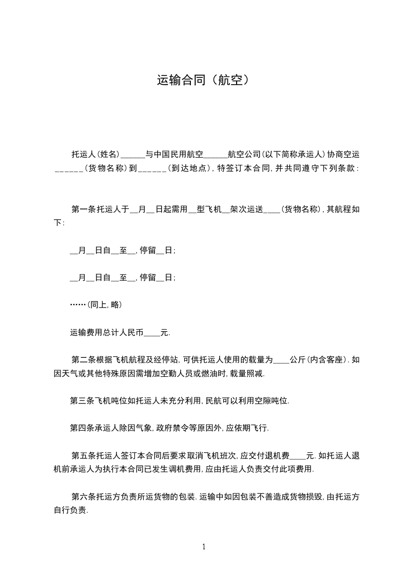 托运人(姓名) ______________ 与中国民用航空 ______________ 航空公司(以下简称承运人)协商空运) ______________ (货物名称)到 ______________ (到达地名),特签订本合同,并共同遵守下列条款: