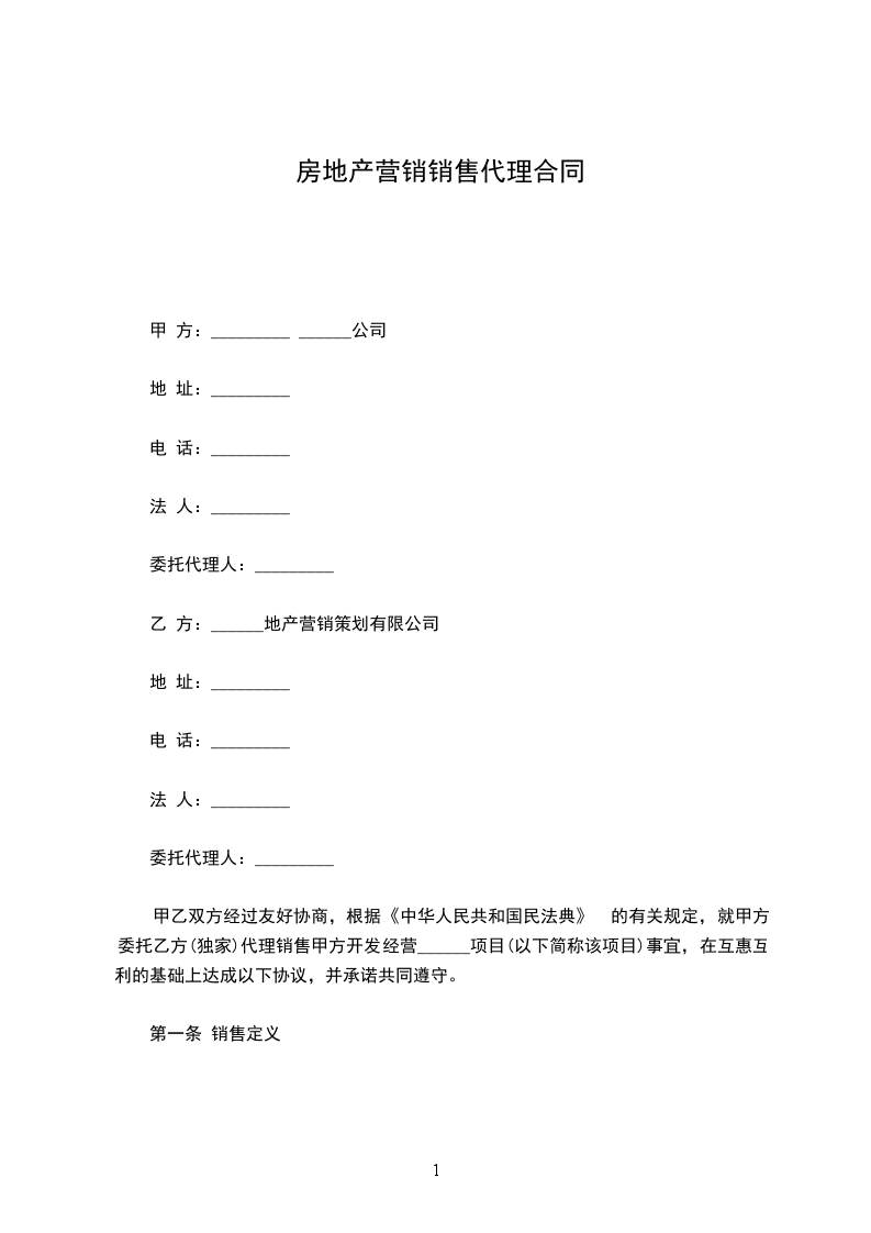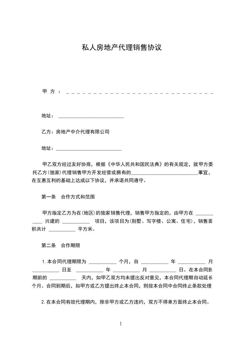 甲乙双方经过友好协商,根据《中华人民共和国民法典》的有关规定,就甲方委托乙方(独家)代理销售甲方开发经营或拥有的___________________________事宜,在互惠互利的基础上达成以下协议,并承诺共同遵守。