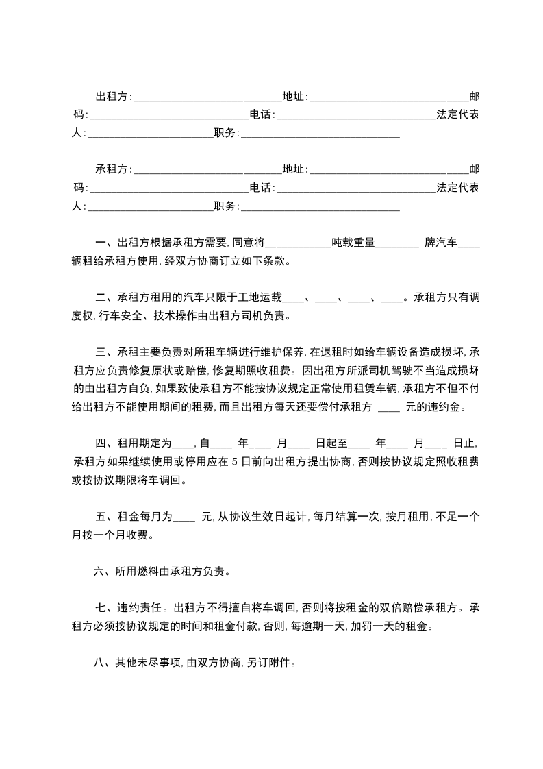 一、出租方根据承租方需要,同意将____________吨载重量________ 牌汽车____ 辆租给承租方使用,经双方协商订立如下条款。