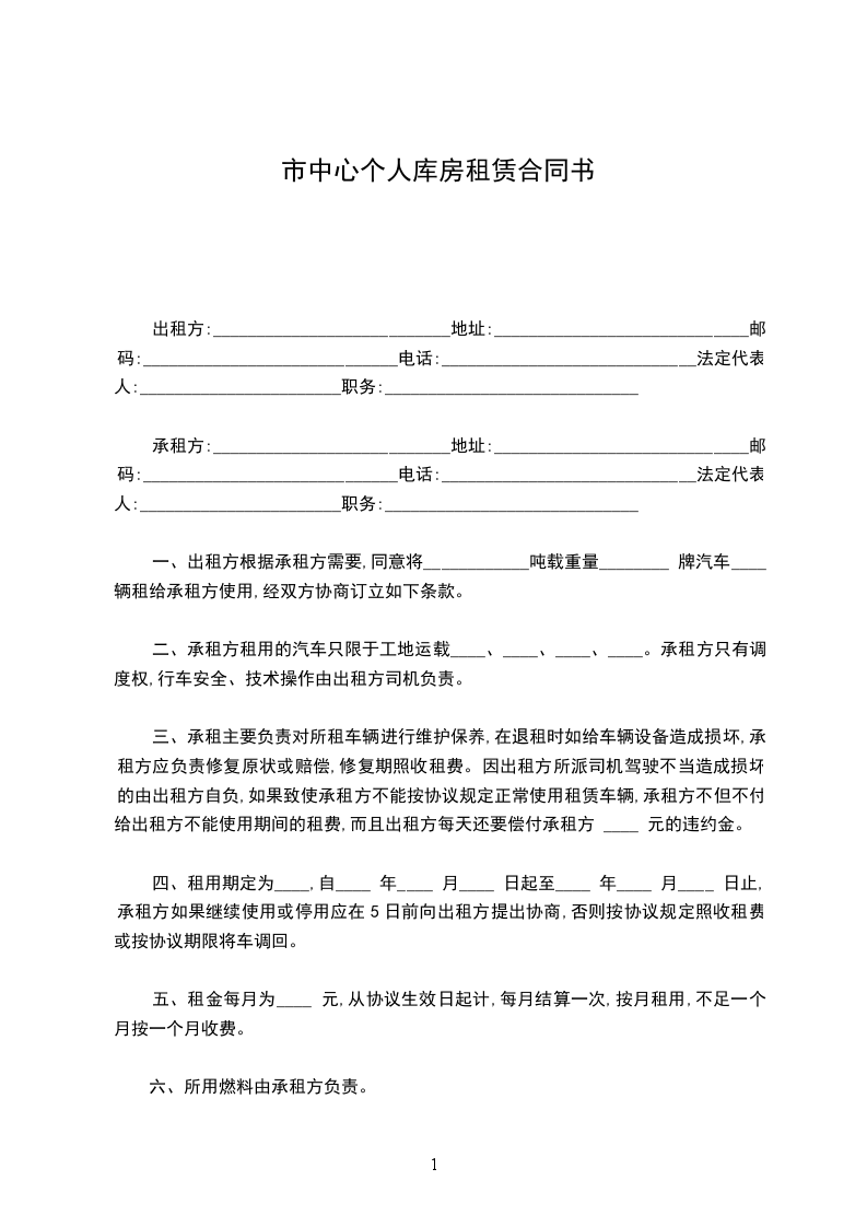一、出租方根据承租方需要,同意将____________吨载重量________ 牌汽车____ 辆租给承租方使用,经双方协商订立如下条款。