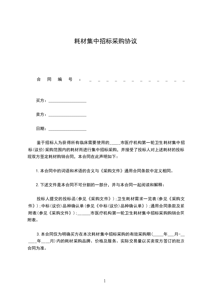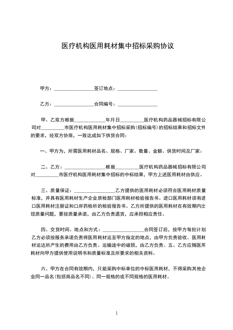 甲、乙双方根据__________________年_____月_____日__________医疗机构药品器械招标有限公司对__________市医疗机构医用耗材集中招标采购(招标编号)的招标结果和招标文件的要求,经双方协商,一致达成如下供货合同:_________________