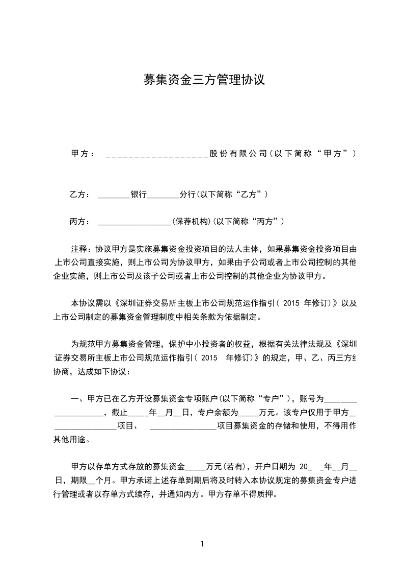 为规范甲方募集资金管理,保护中小投资者的权益,根据有关法律法规及《深圳证券交易所主板上市公司规范运作指引( 2024 年修订)》的规定,甲、乙、丙三方经协商,达成如下协议: