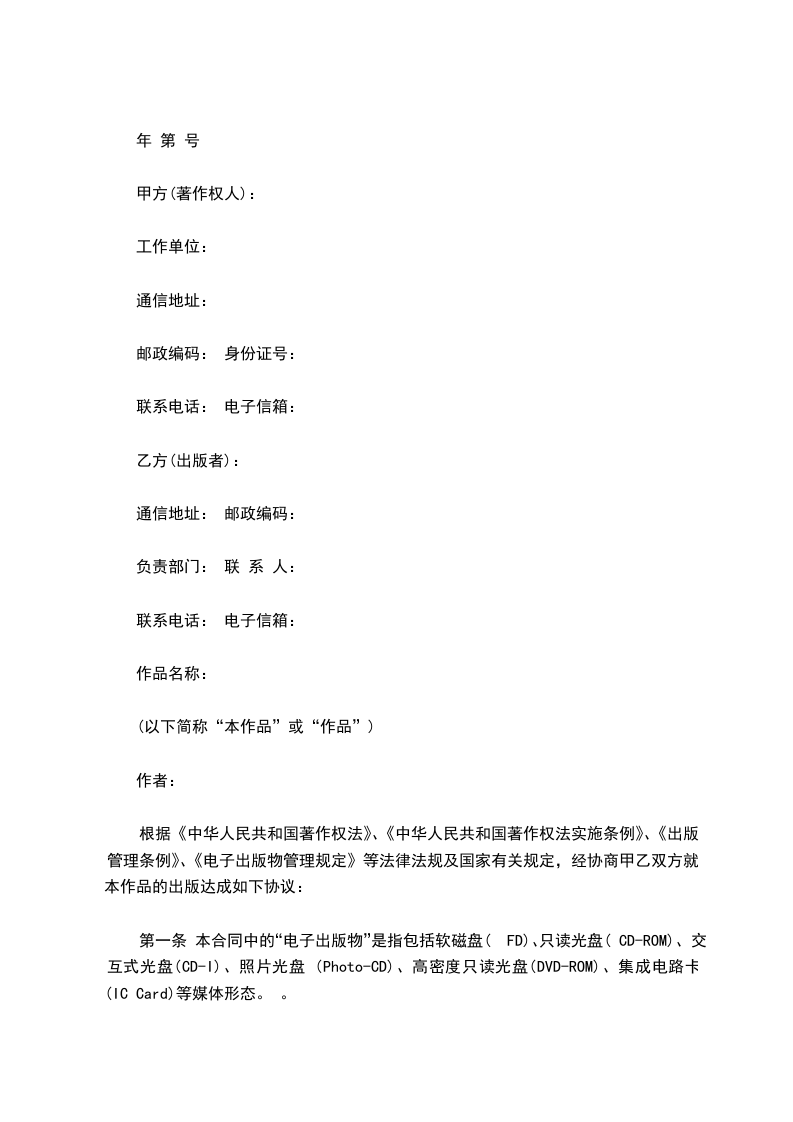 第一条 本合同中的“电子出版物”是指包括软磁盘(FD)、只读光盘(CD-ROM)、交互式光盘(CD-I)、照片光盘 (Photo-CD)、高密度只读光盘(DVD-ROM)、集成电路卡(IC Card)等媒体形态。 。