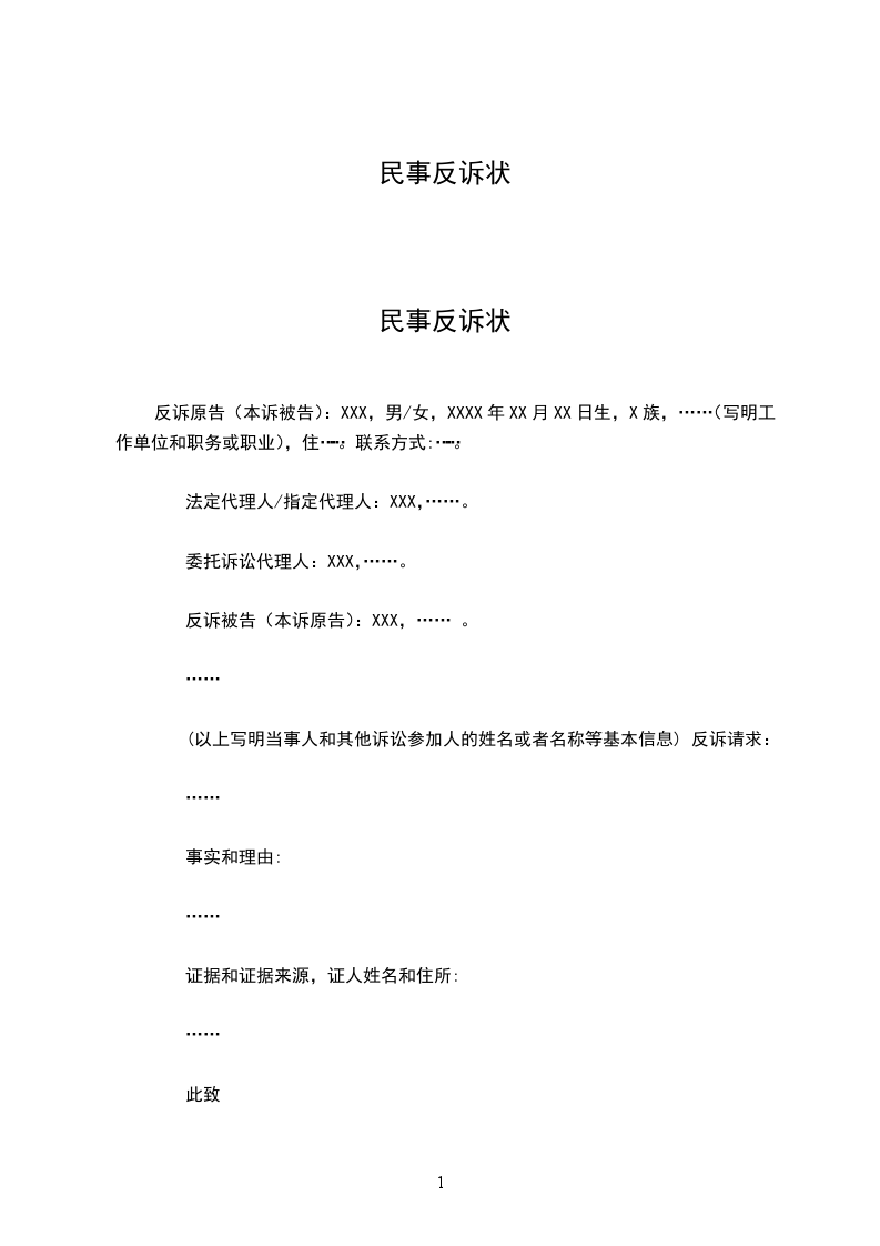 1. 本样式根据《中华人民共和国民事诉讼法》第五十一条、第一百二十条第一款、第一百二十 一条制定,供公民提起民事反诉用。