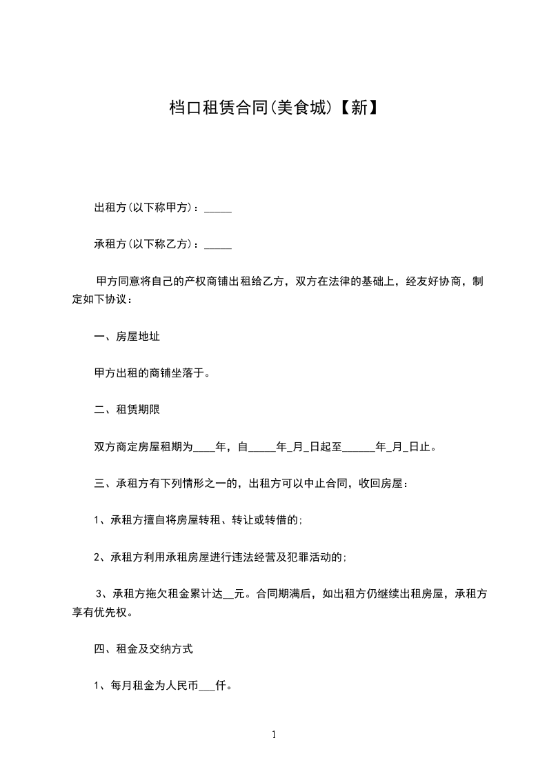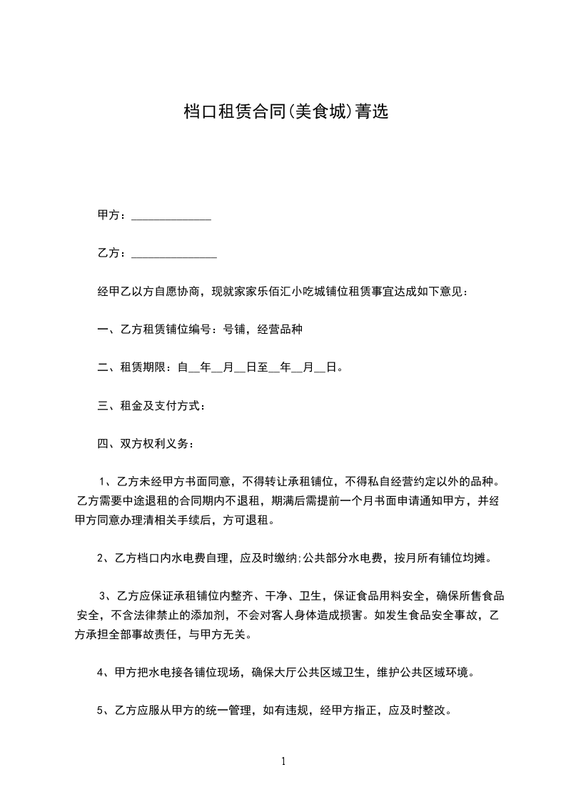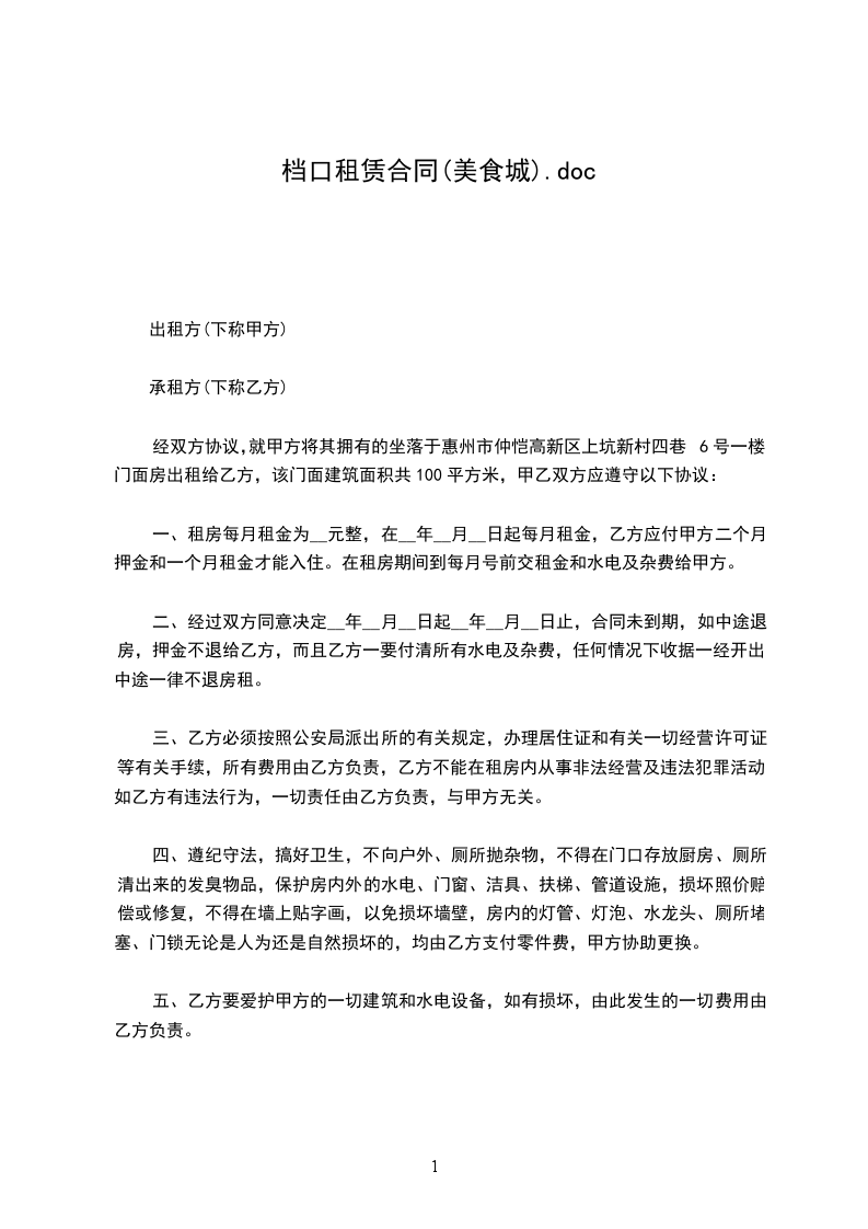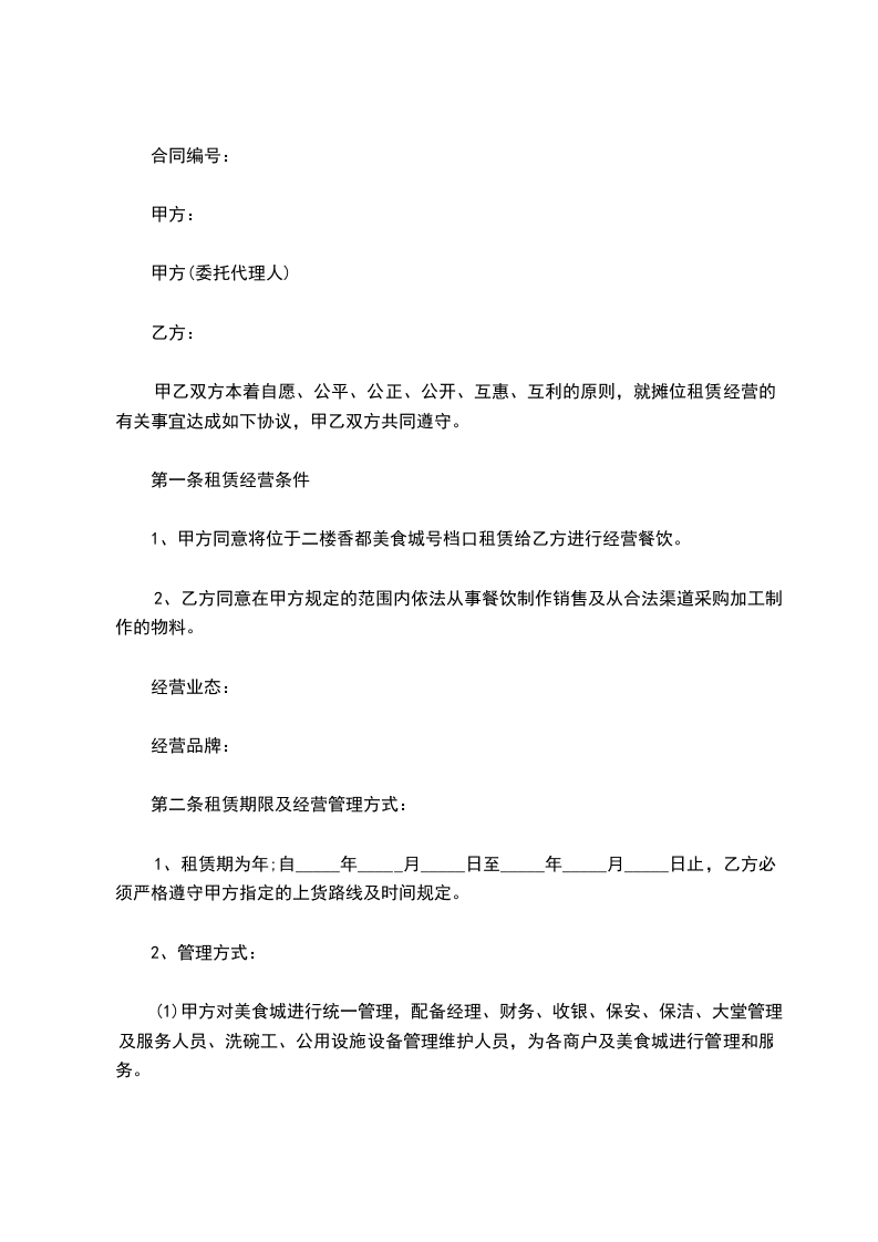 1、甲方同意将位于二楼香都美食城号档口租赁给乙方进行经营餐饮。