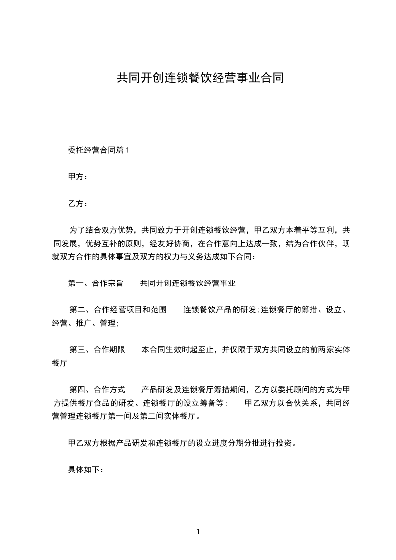 为了结合双方优势,共同致力于开创连锁餐饮经营,甲乙双方本着平等互利,共同发展,优势互补的原则,经友好协商,在合作意向上达成一致,结为合作伙伴,现就双方合作的具体事宜及双方的权力与义务达成如下合同: