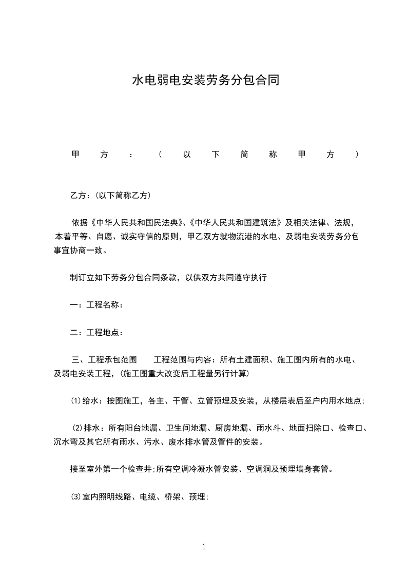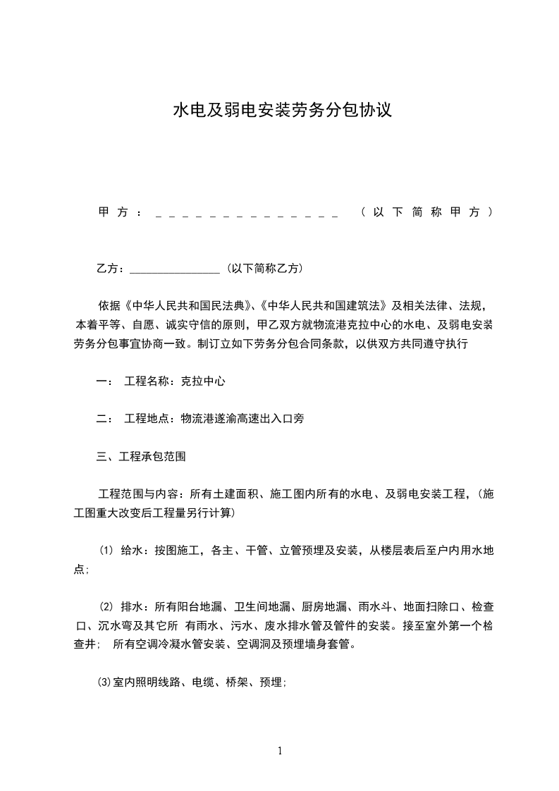 依据《中华人民共和国民法典》、《中华人民共和国建筑法》及相关法律、法规,本着平等、自愿、诚实守信的原则,甲乙双方就物流港克拉中心的水电、及弱电安装劳务分包事宜协商一致。