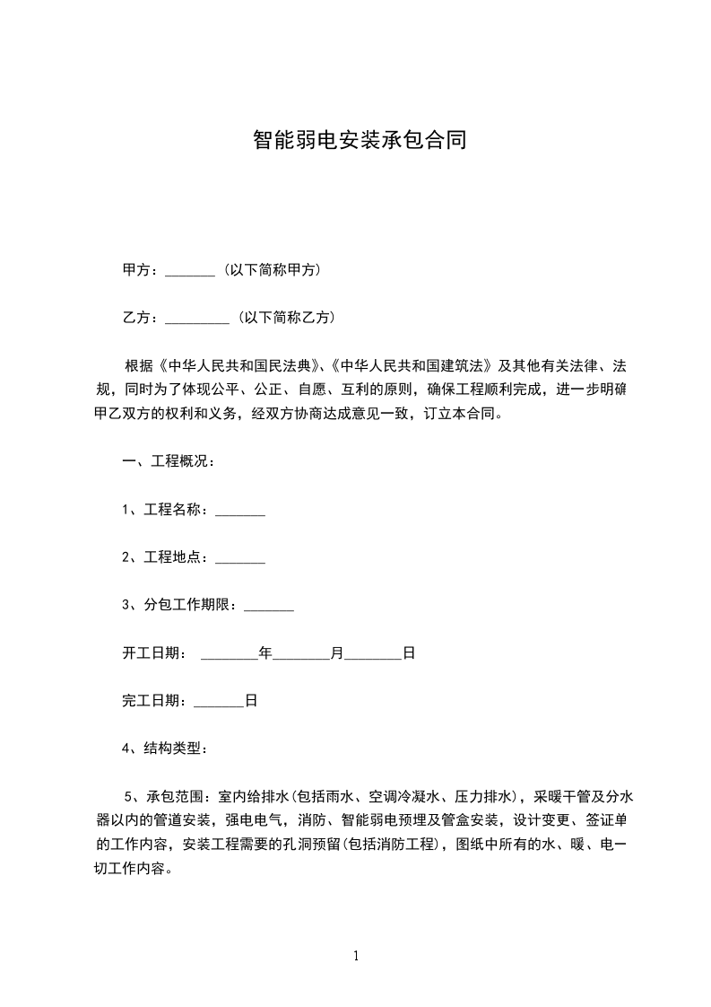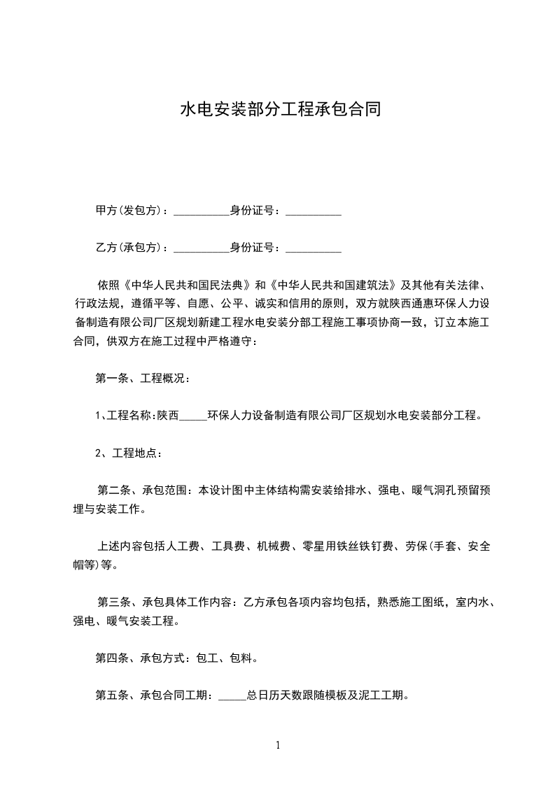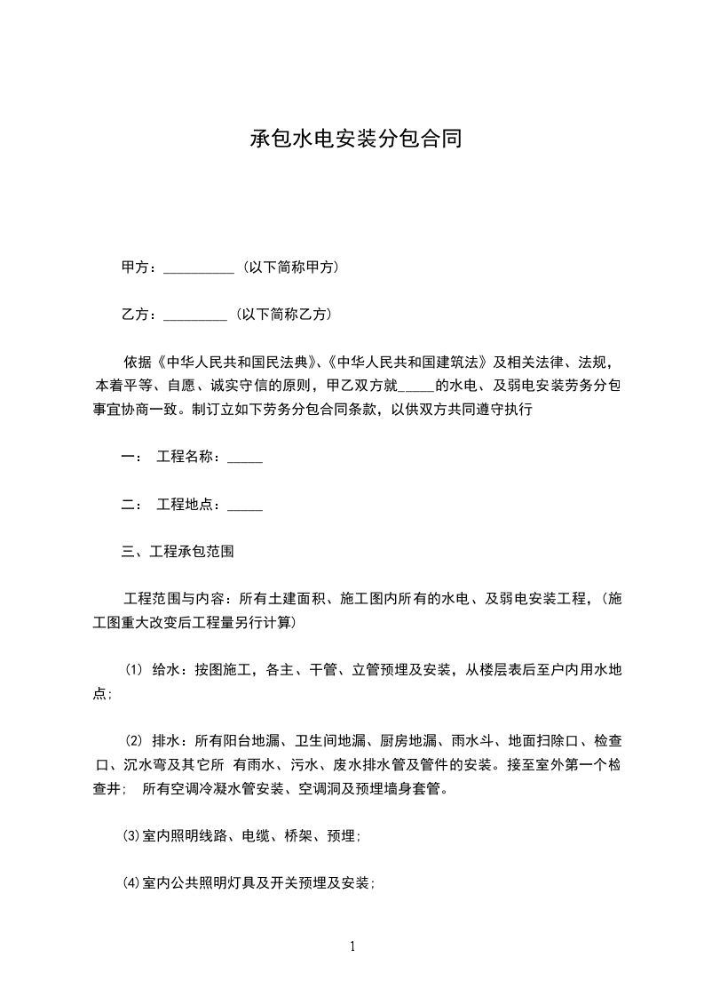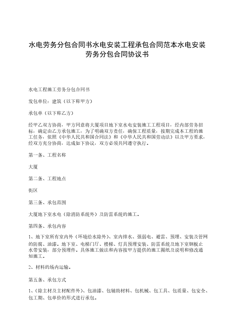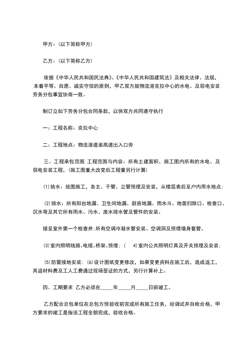 依据《中华人民共和国民法典》、《中华人民共和国建筑法》及相关法律、法规,本着平等、自愿、诚实守信的原则,甲乙双方就物流港的水电、及弱电安装劳务分包事宜协商一致。