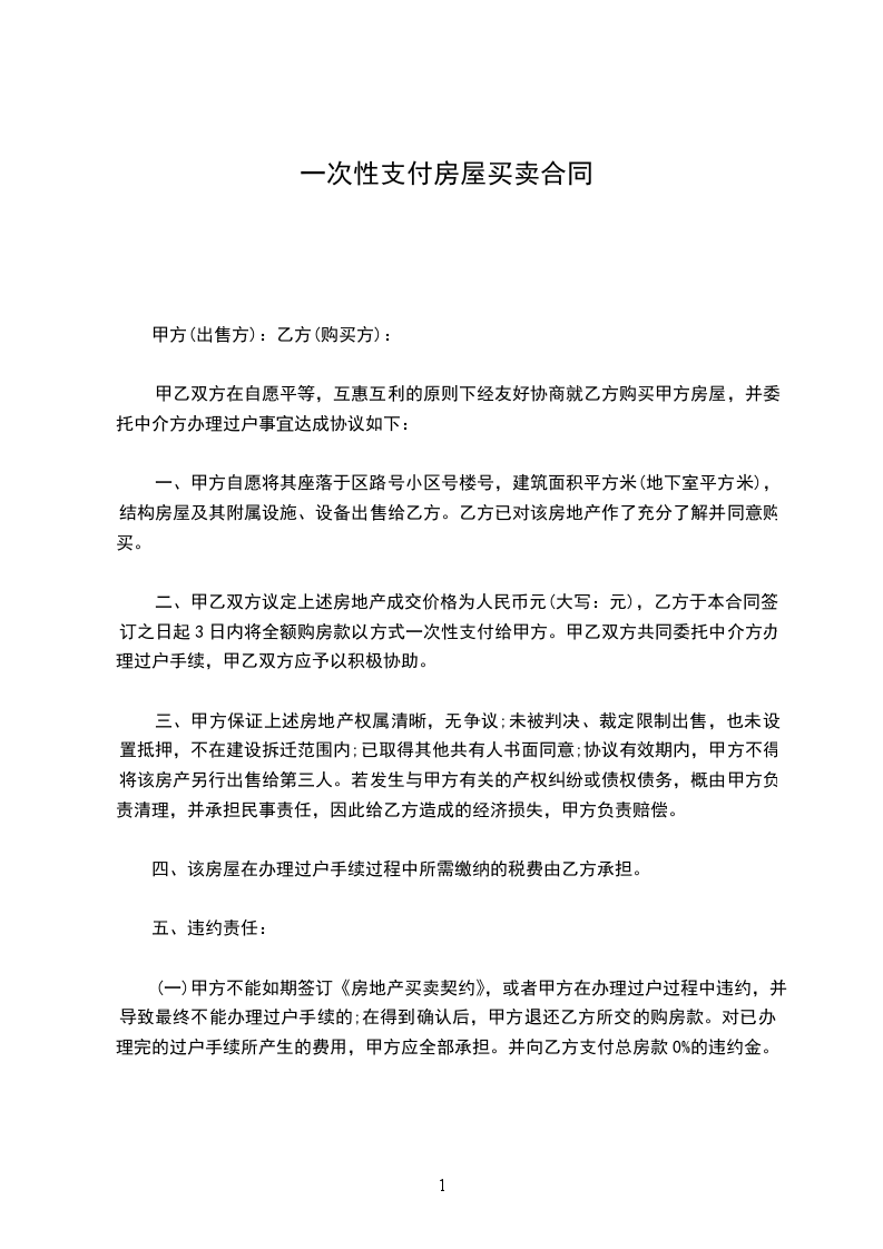 二、甲乙双方议定上述房地产成交价格为人民币_____元(大写:元),乙方于本合同签订之日起3日内将全额购房款以方式一次性支付给甲方。甲乙双方共同委托中介方办理过户手续,甲乙双方应予以积极协助。