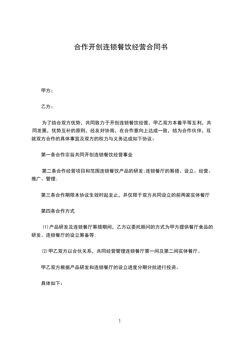 为了结合双方优势,共同致力于开创连锁餐饮经营,甲乙双方本着平等互利,共同发展,优势互补的原则,经友好协商,在合作意向上达成一致,结为合作伙伴,现就双方合作的具体事宜及双方的权力与义务达成如下协议: