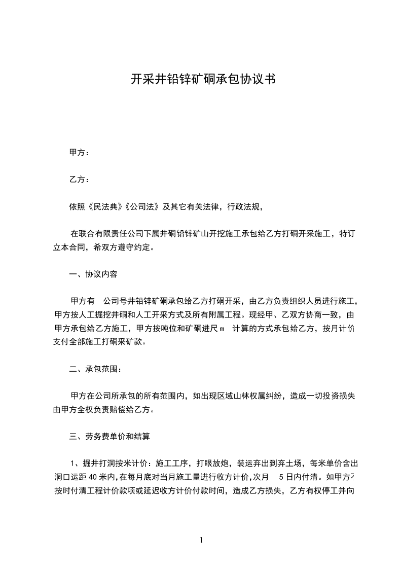 在联合有限责任公司下属井硐铅锌矿山开挖施工承包给乙方打硐开采施工,特订立本合同,希双方遵守约定。