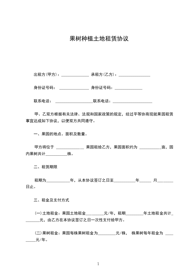 (一)土地租金:果园土地租金_________元/年,租期_________年土地租金共计________元,由乙方在本协议签订之日一次性支付给甲方。