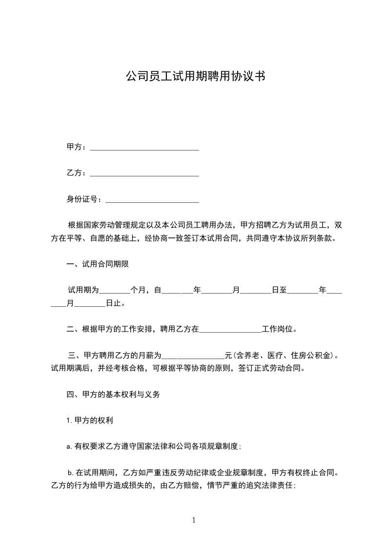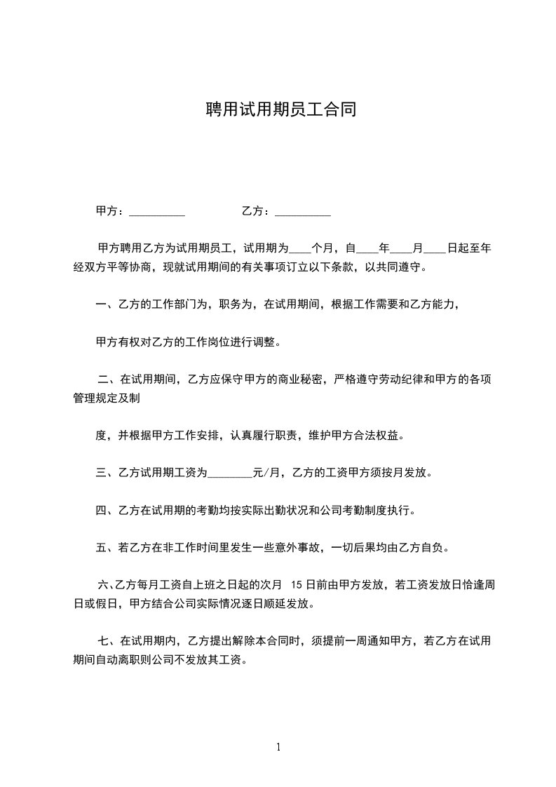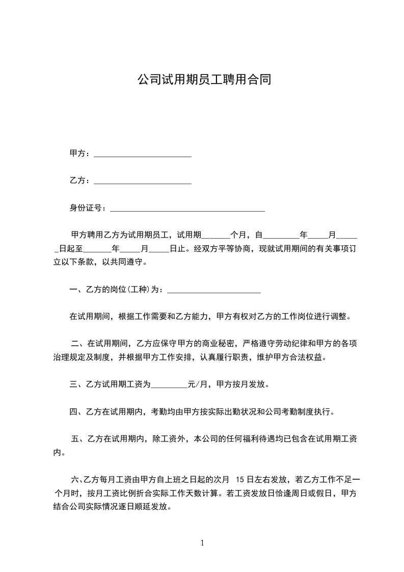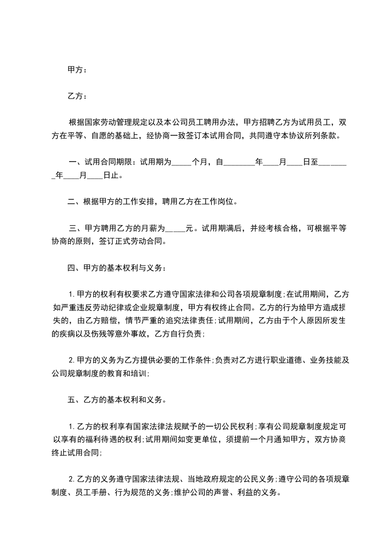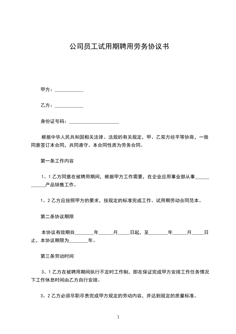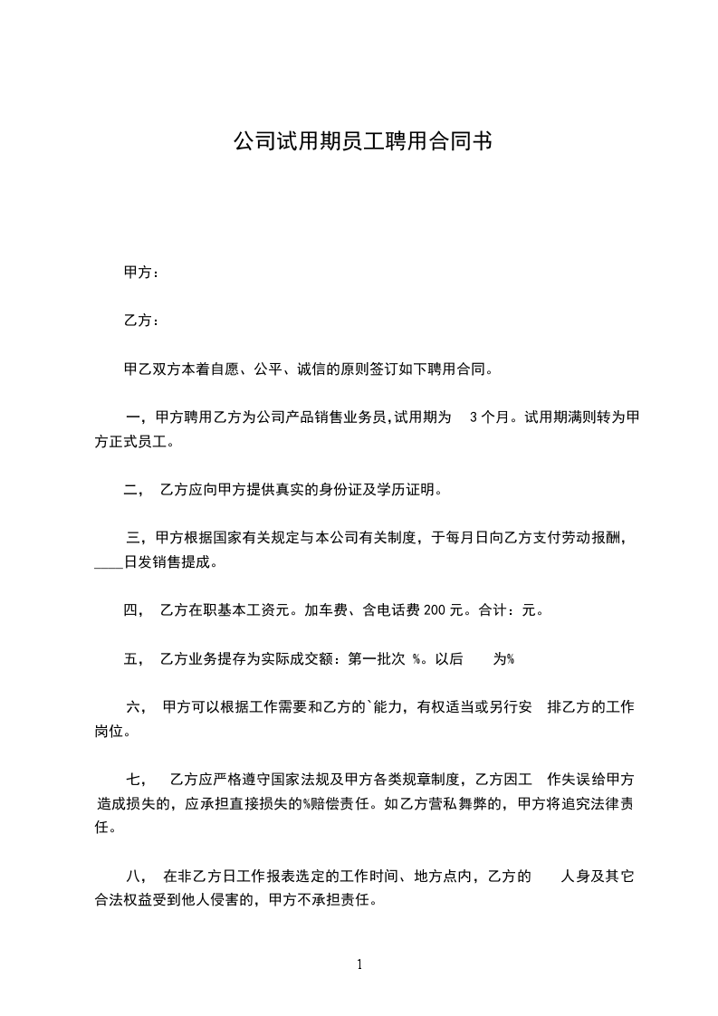 一, 甲方聘用乙方为公司产品销售业务员,试用期为3个月。试用期满则转为甲方正式员工。