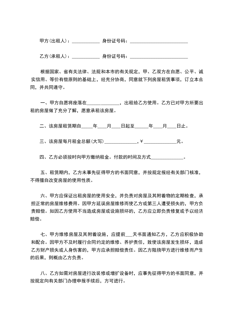 承租方(乙方): ,身份证号码