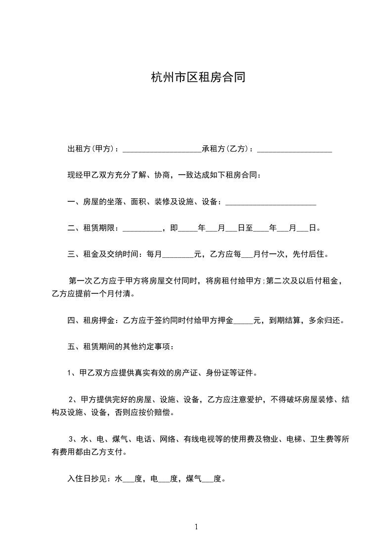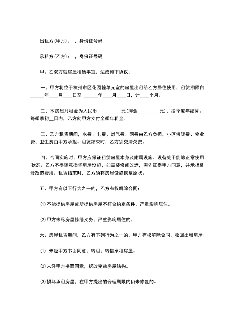 一、甲方将位于杭州市区花园幢单元室的房屋出租给乙方居住使用,租赁期限自______年____月____日至 ______年____月____日,计____个月。