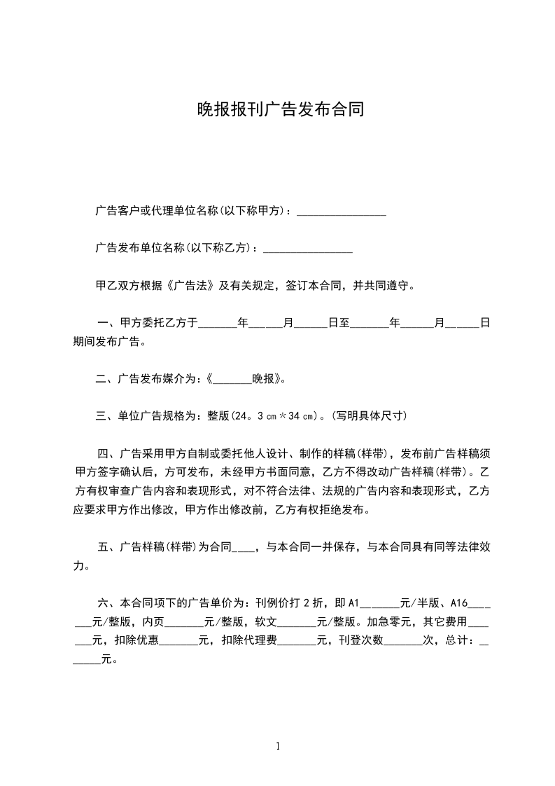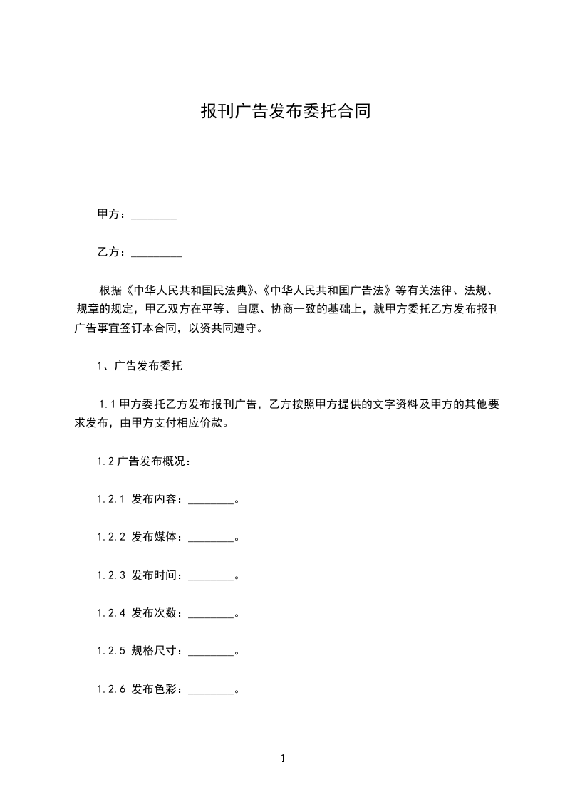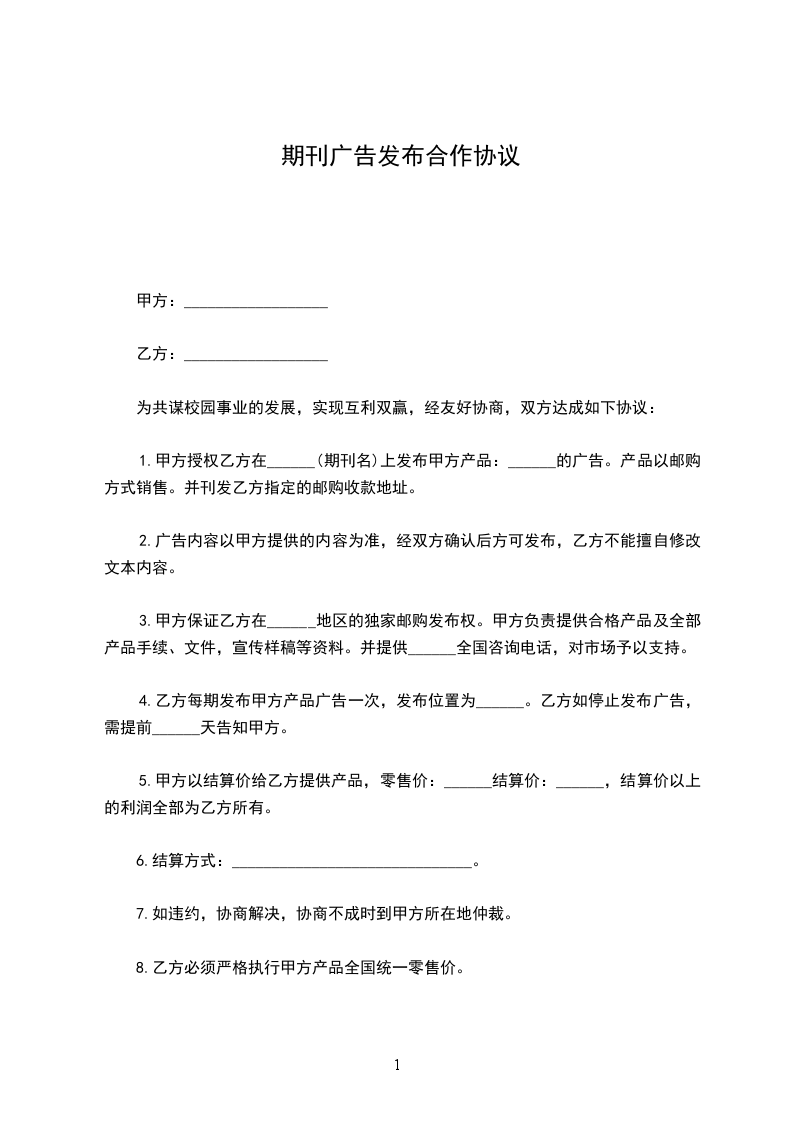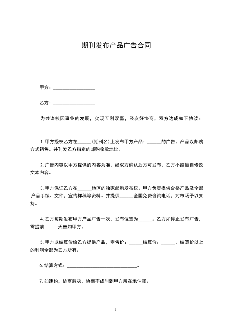 1.甲方授权乙方在______(期刊名)上发布甲方产品:______的广告。产品以邮购方式销售。并刊发乙方指定的邮购收款地址。