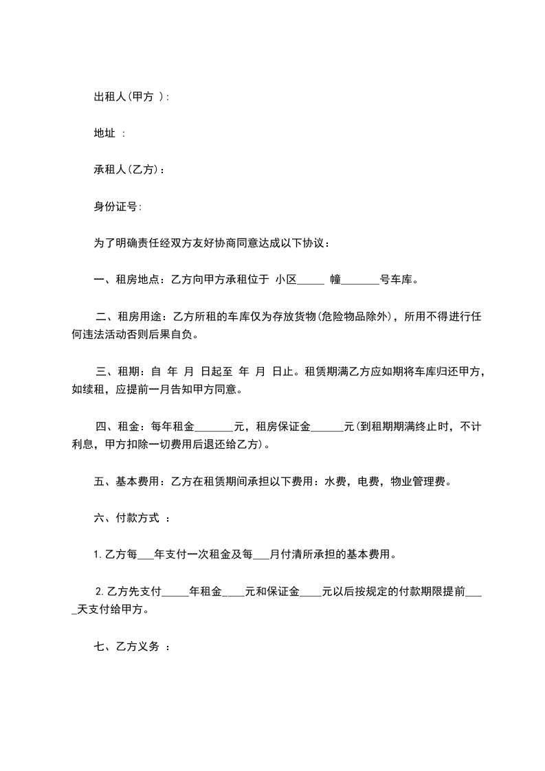 二、租房用途:乙方所租的车库仅为存放货物(危险物品除外),所用不得进行任何违法活动否则后果自负。
