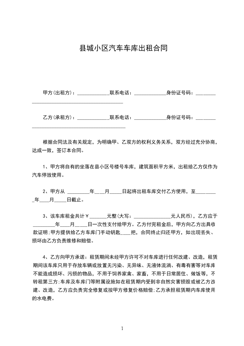 1、甲方将自有的坐落在县小区号楼号车库,建筑面积平方米,出租给乙方仅作为汽车停放使用。