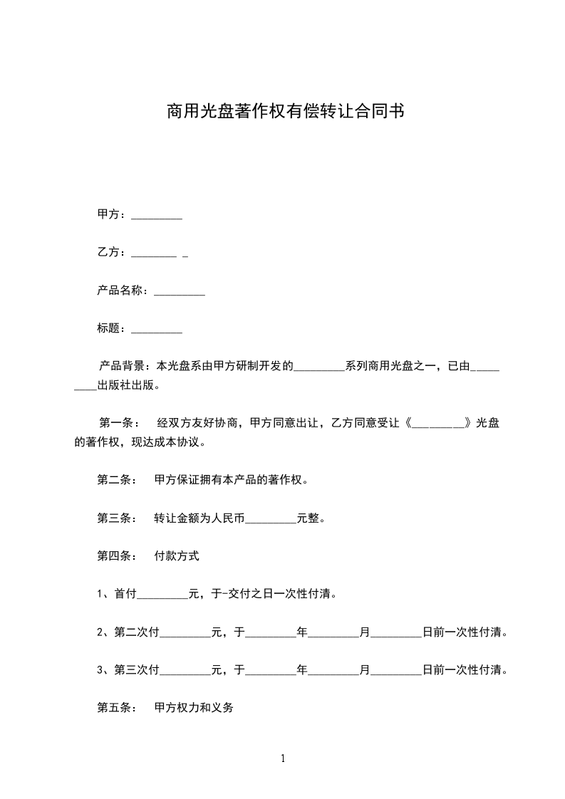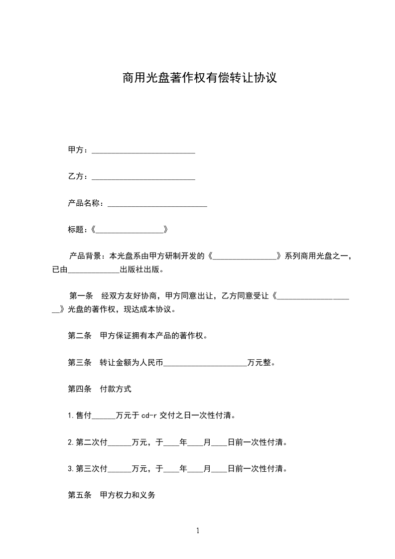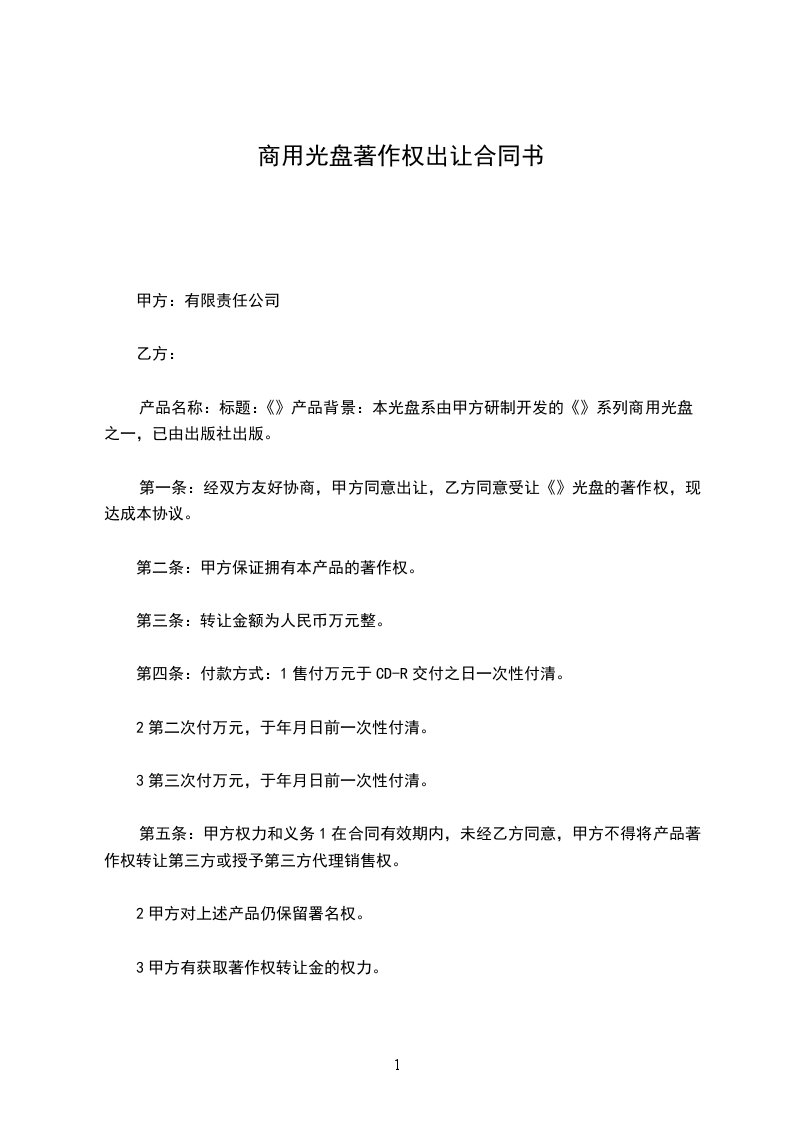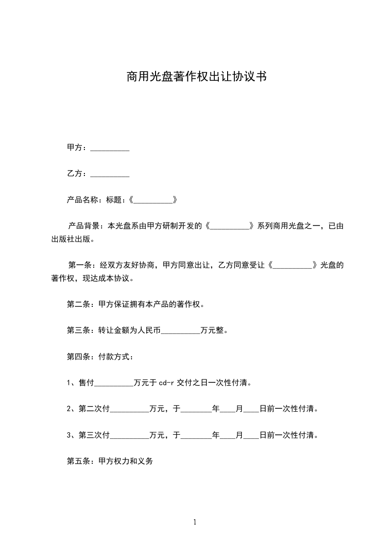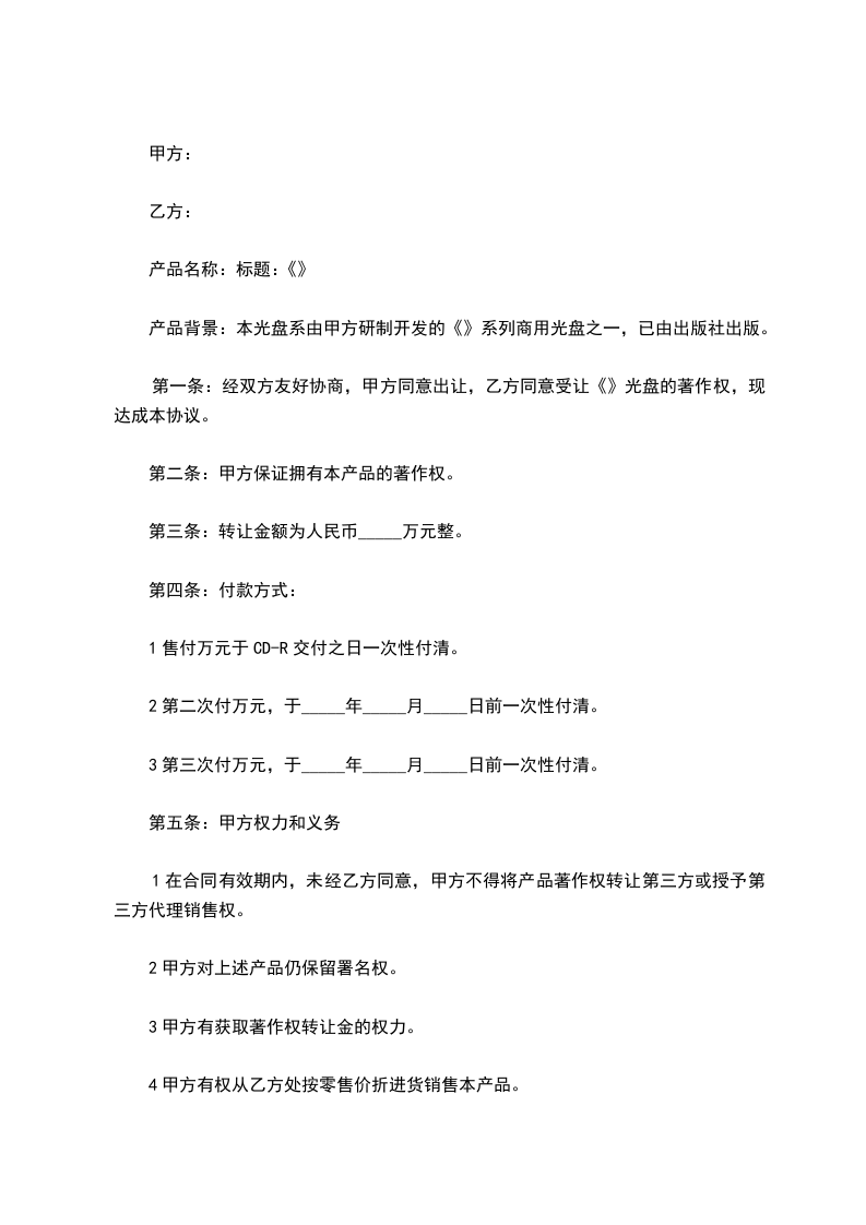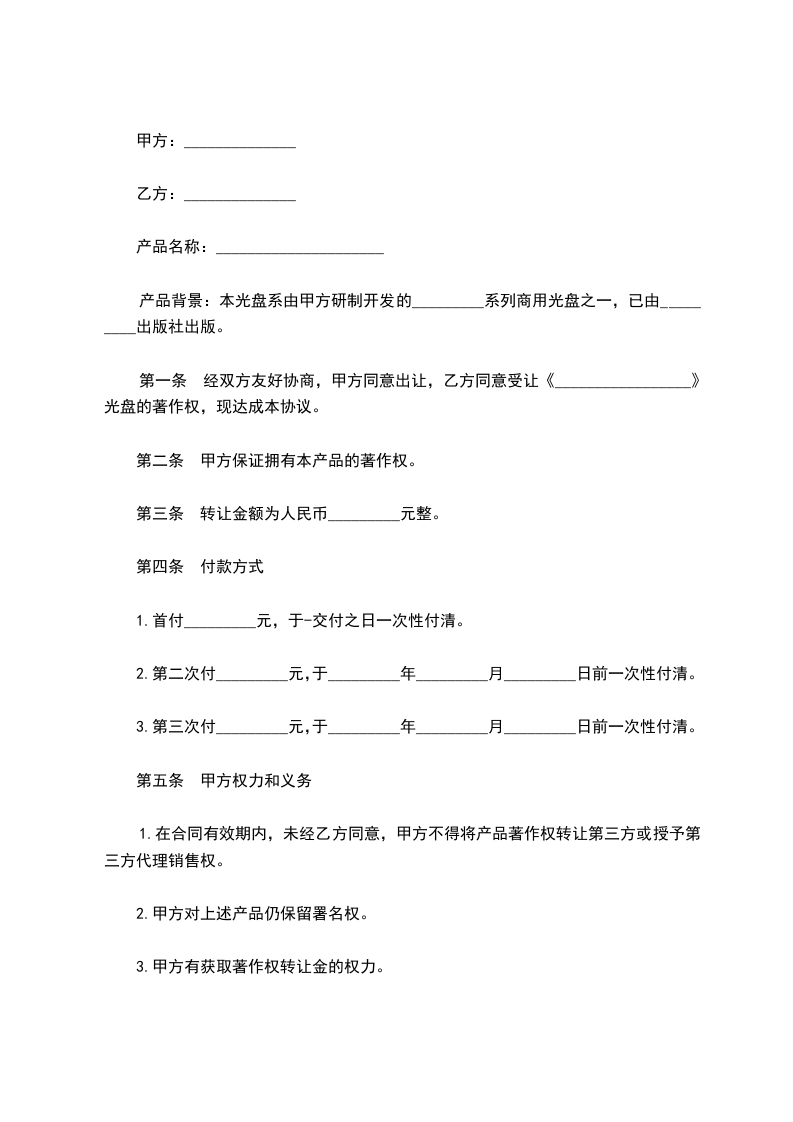 第一条: 经双方友好协商,甲方同意出让,乙方同意受让《_________》光盘的著作权,现达成本协议。