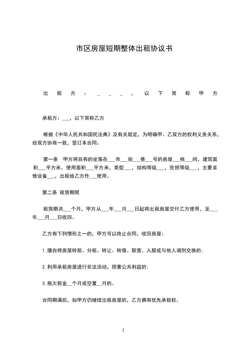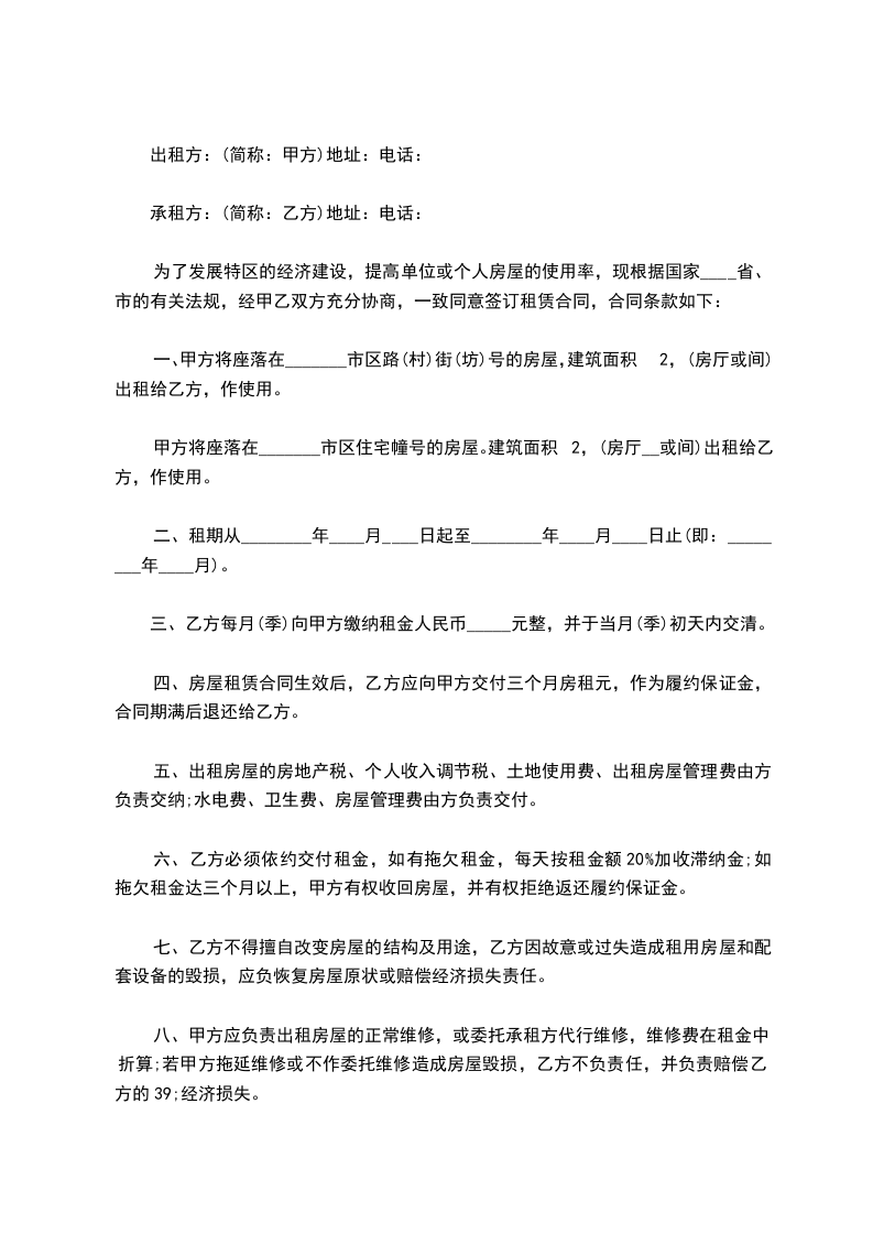为了发展特区的经济建设,提高单位或个人房屋的使用率,现根据国家____省、市的有关法规,经甲乙双方充分协商,一致同意签订租赁合同,合同条款如下: