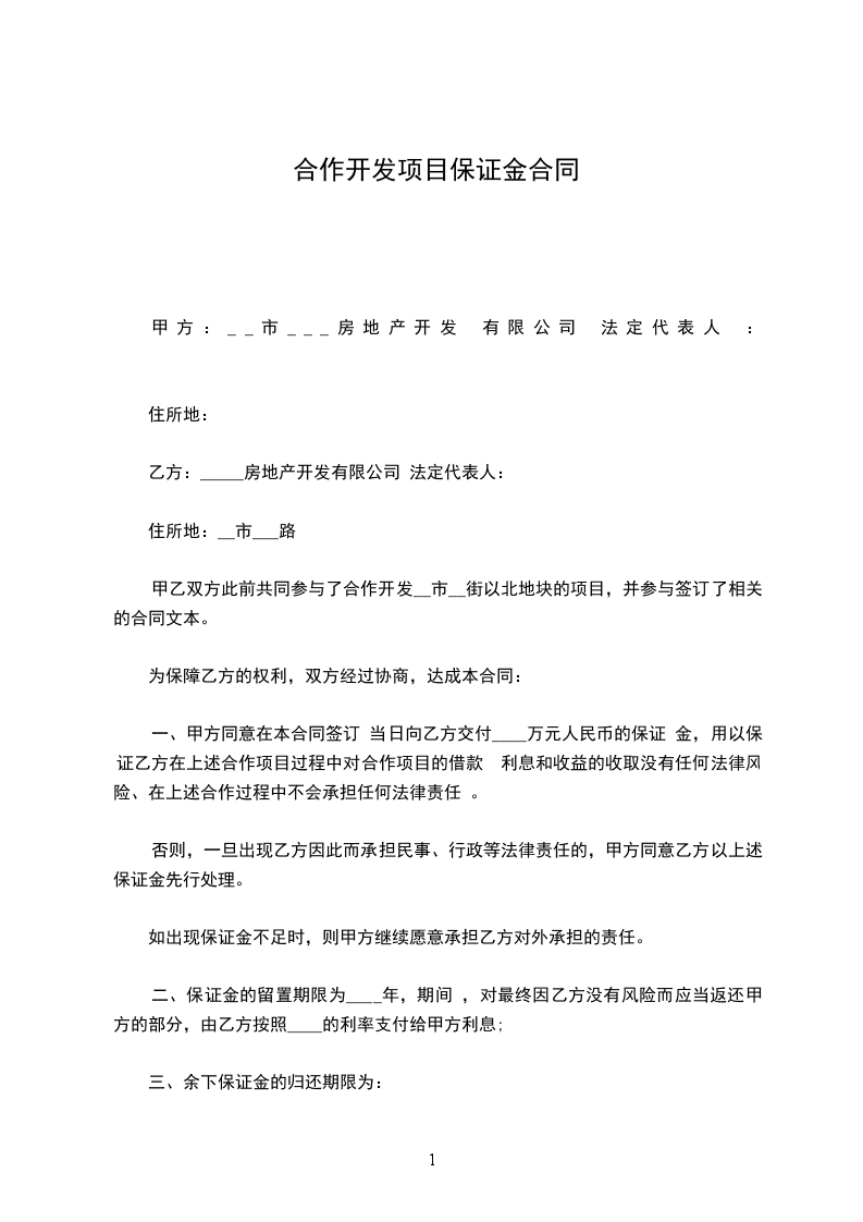 一、甲方同意在本合同签订 当日向乙方交付____万元人民币的保证 金,用以保证乙方在上述合作项目过程中对合作项目的借款 利息和收益的收取没有任何法律风险、在上述合作过程中不会承担任何法律责任 。