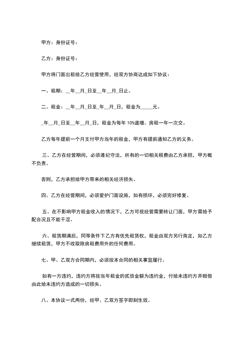 甲方将门面出租给乙方经营使用,经双方协商达成如下协议: