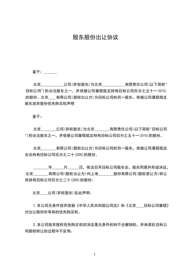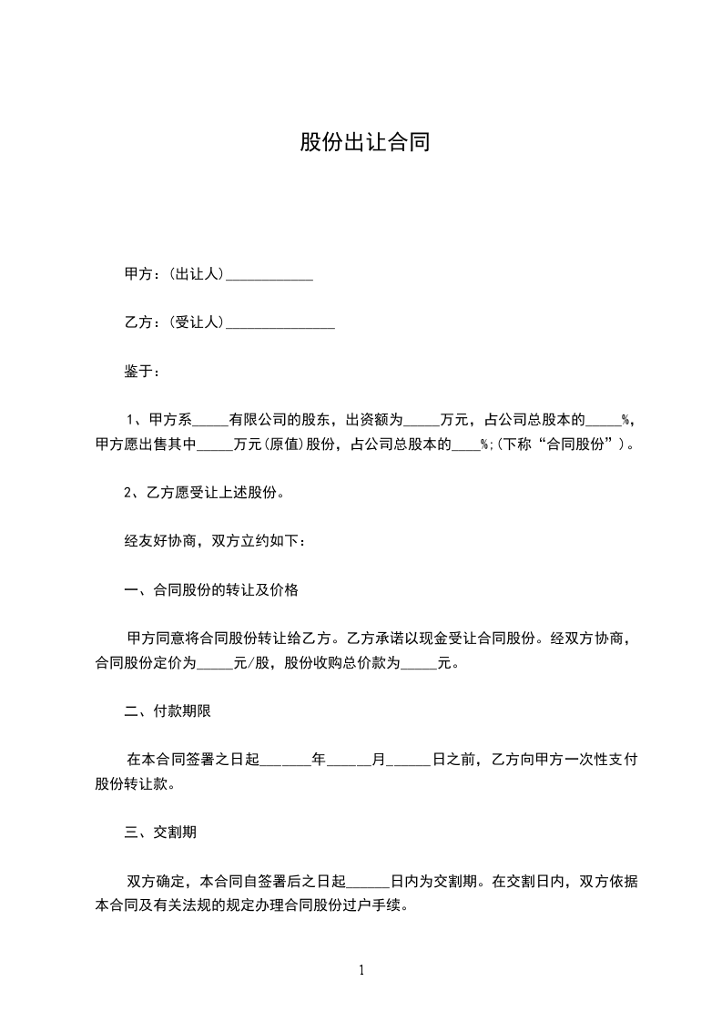 一、转让方将其在__________________公司(以下简称公司)_______%的股份(人民币_________元)依法转让给受让方。
