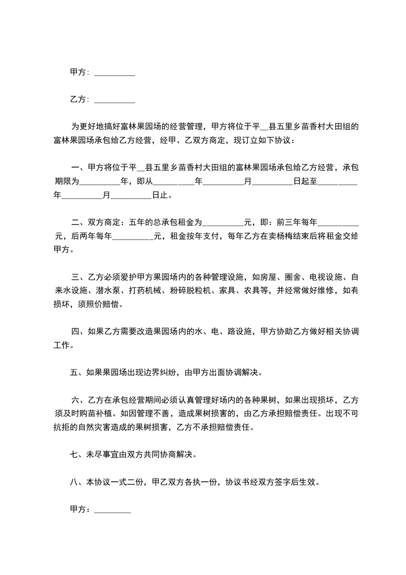 一、甲方将位于平__县五里乡苗香村大田组的富林果园场承包给乙方经营,承包期限为__________年,即从__________年__________月__________日起至__________年__________月__________日止。