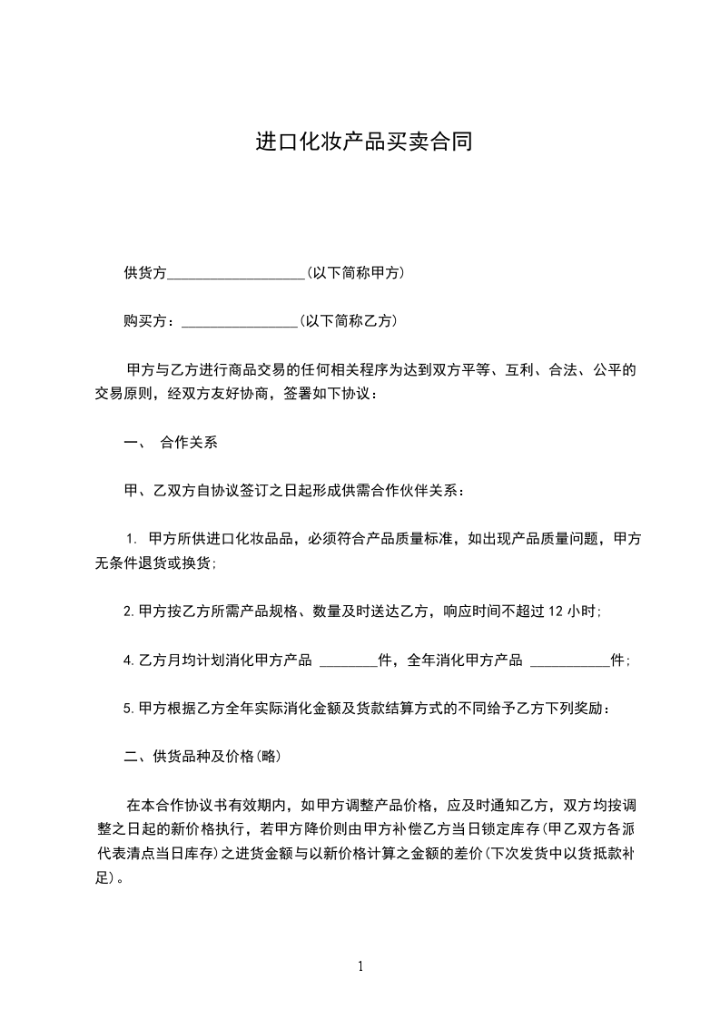 1. 甲方所供进口化妆品品,必须符合产品质量标准,如出现产品质量问题,甲方无条件退货或换货;