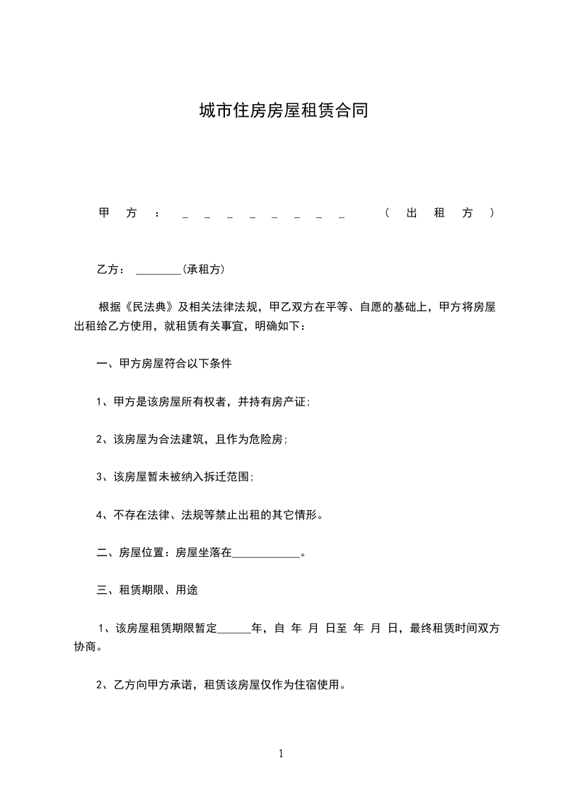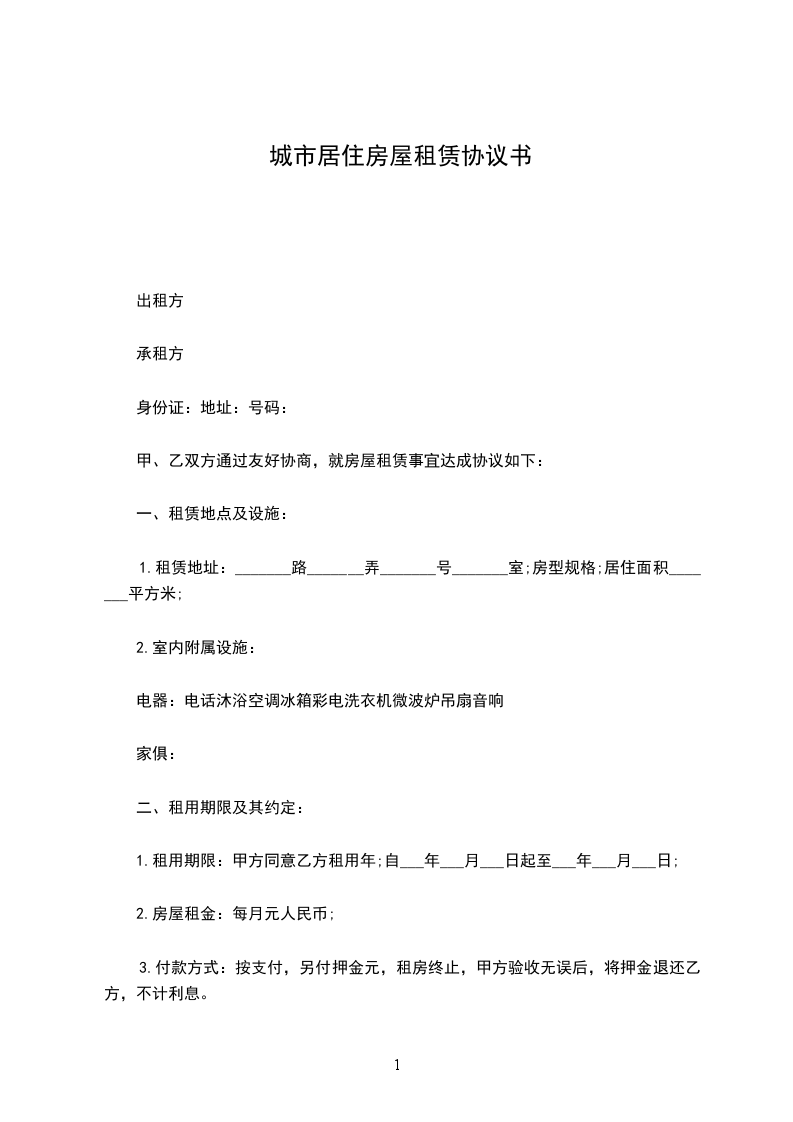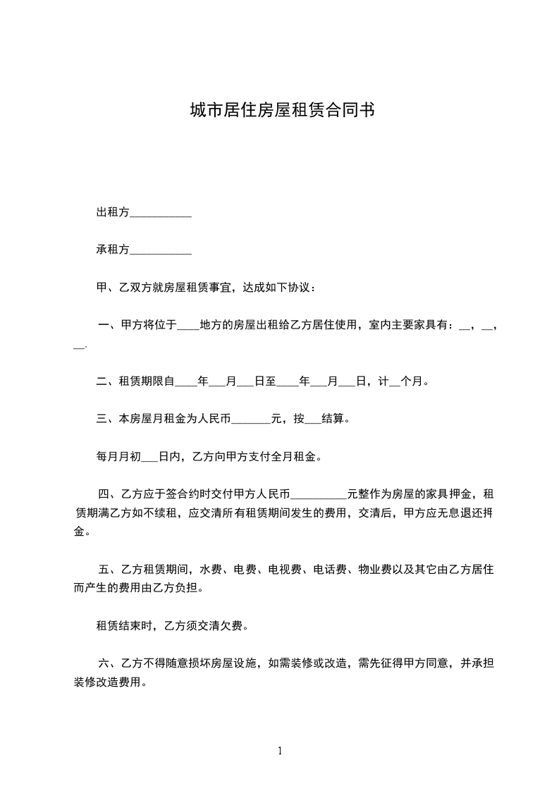 一、甲方将位于____地方的房屋出租给乙方居住使用,室内主要家具有:__,__,__.