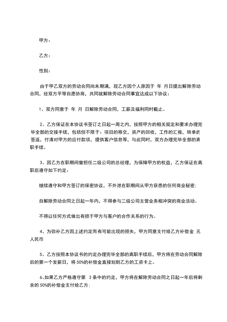 由于甲乙双方的劳动合同尚未期满,现乙方因个人原因于 年 月日提出解除劳动合同,经双方平等自愿协商,共同就解除劳动合同事宜达成以下协议:
