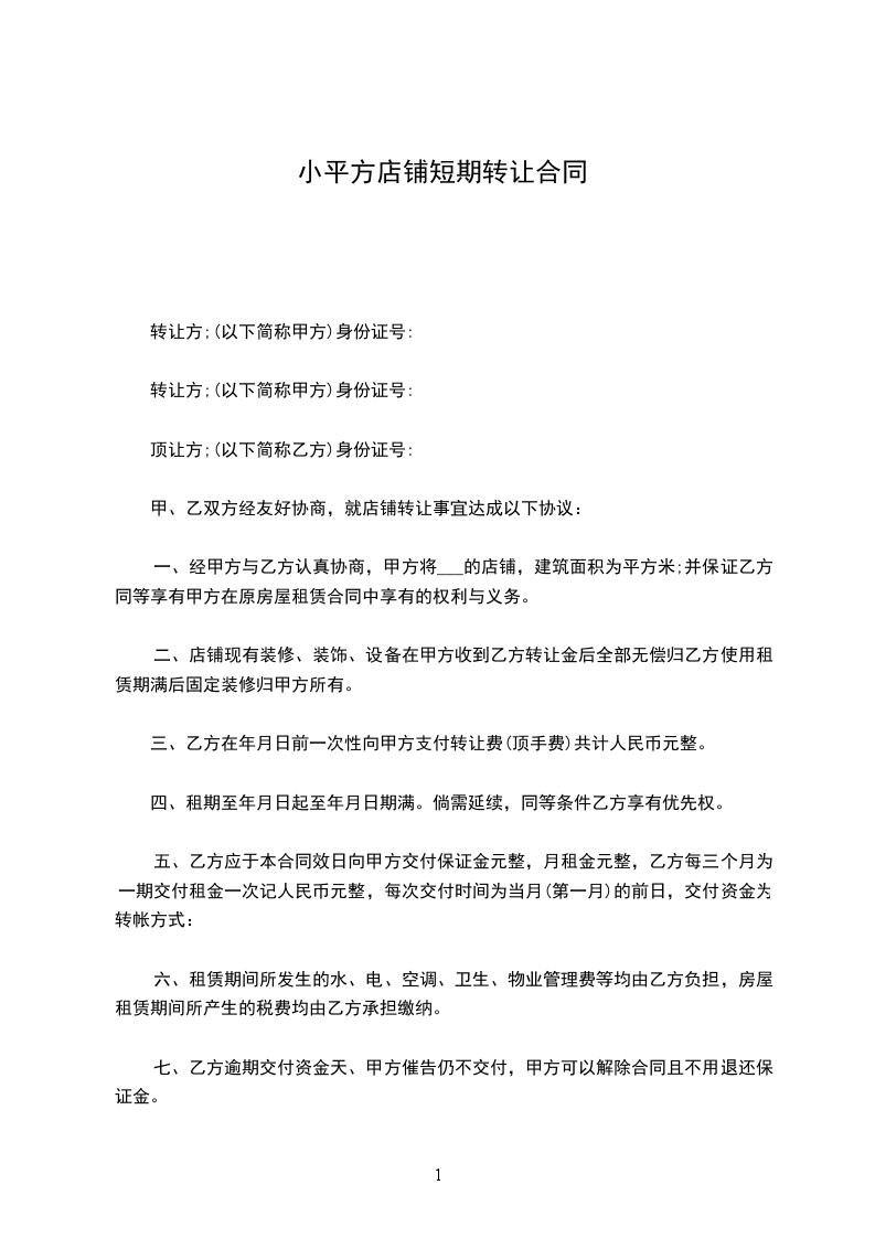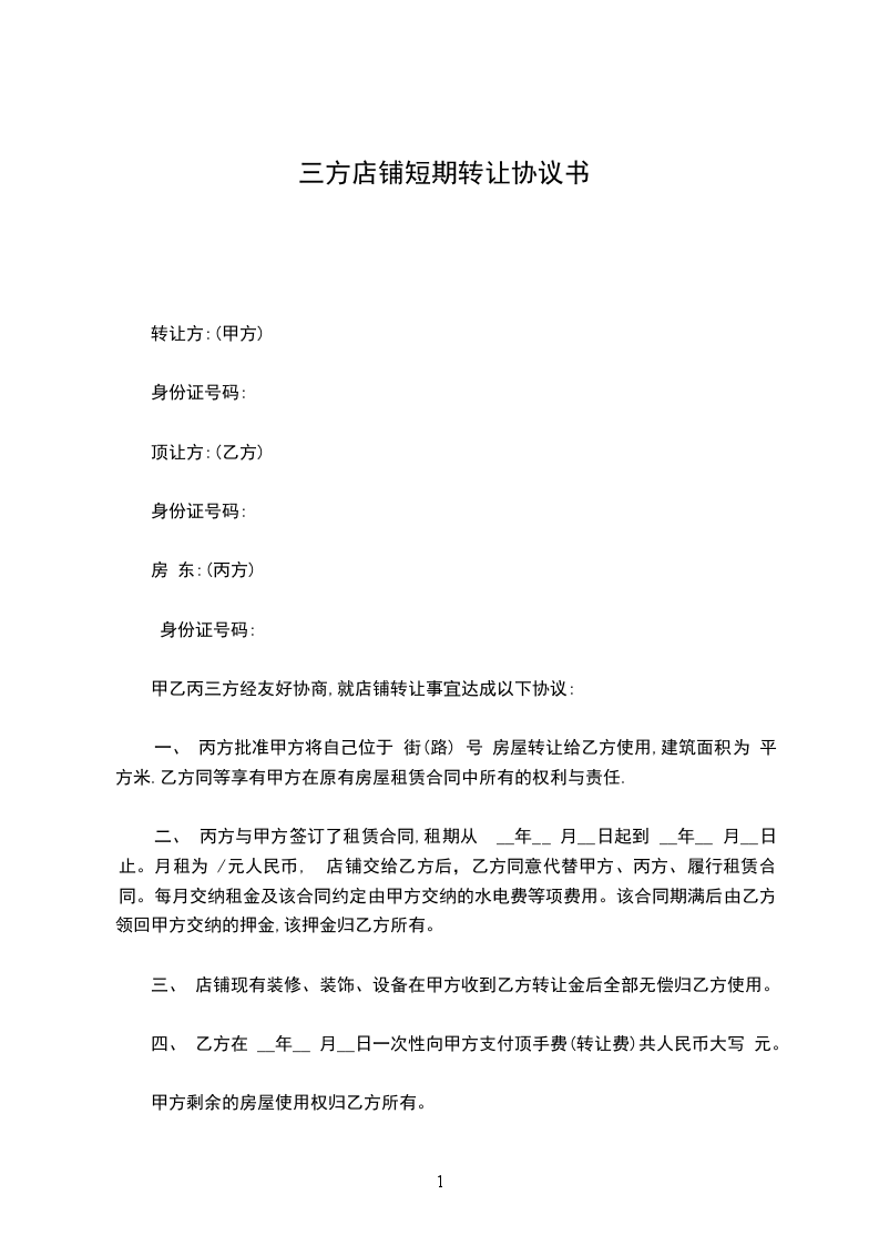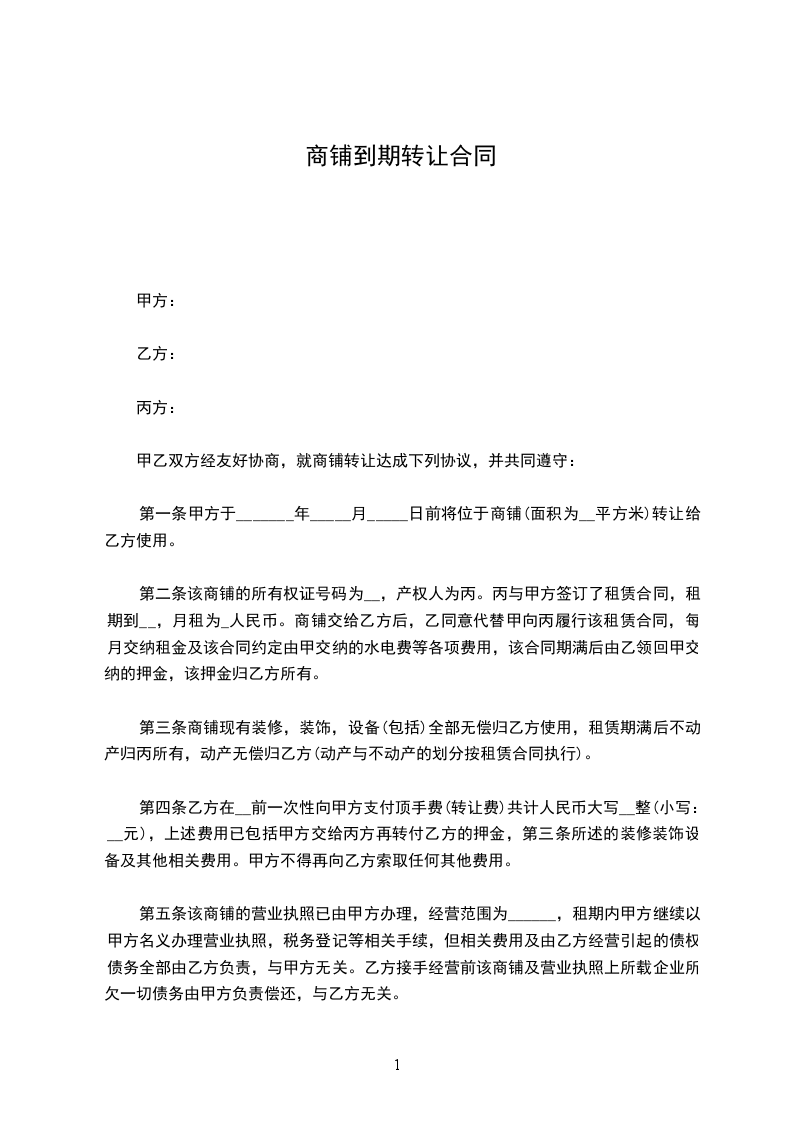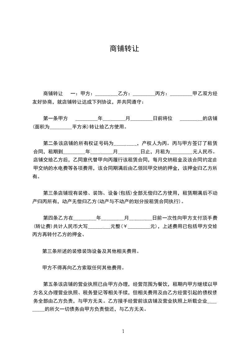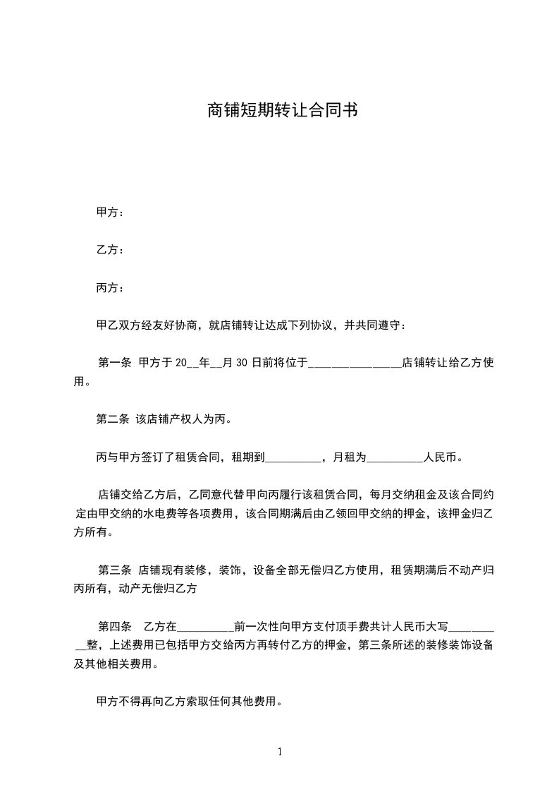 第一条 甲方于20__年__月30日前将位于________________店铺转让给乙方使用。