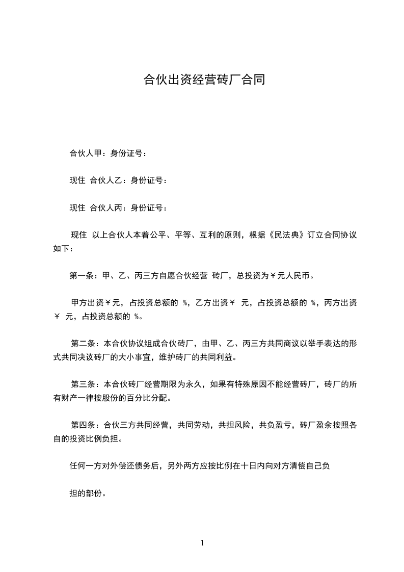 第一条:甲、乙、丙三方自愿合伙经营 砖厂,总投资为¥元人民币。