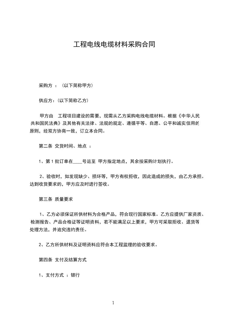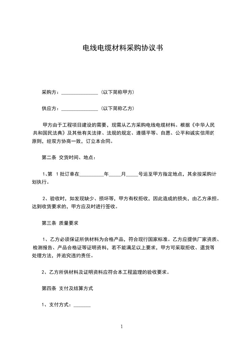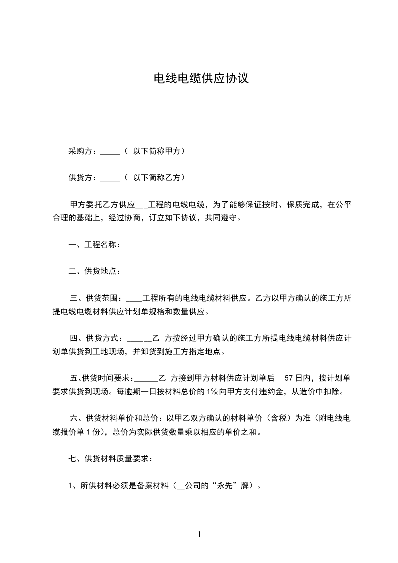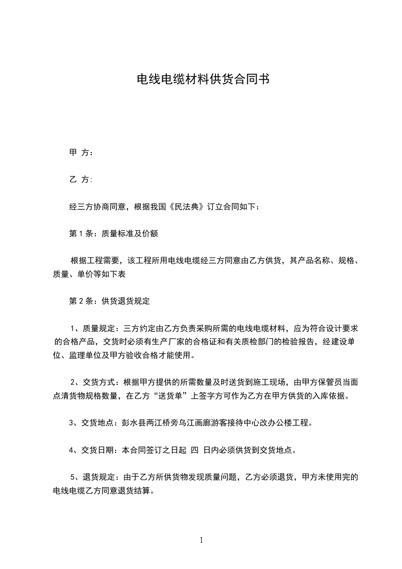 5、退货规定:由于乙方所供货物发现质量问题,乙方必须退货,甲方未使用完的电线电缆乙方同意退货结算。