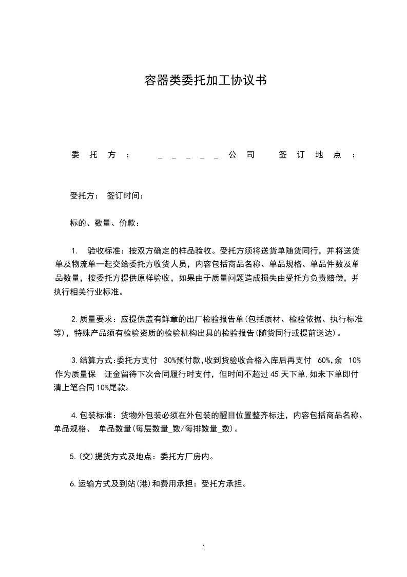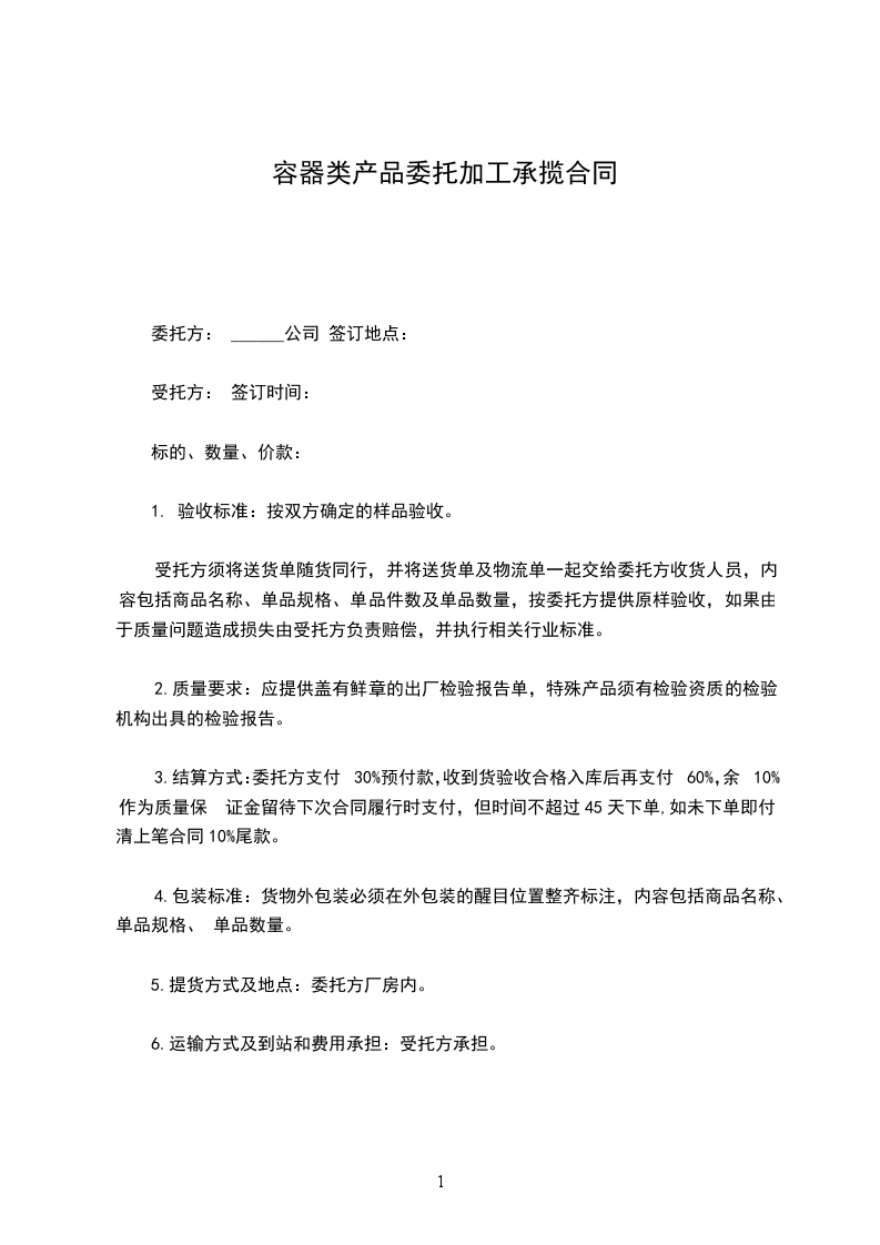 3.结算方式:委托方支付30%预付款,收到货验收合格入库后再支付60%,余10%作为质量保 证金留待下次合同履行时支付,但时间不超过45天下单,如未下单即付清上笔合同10%尾款。