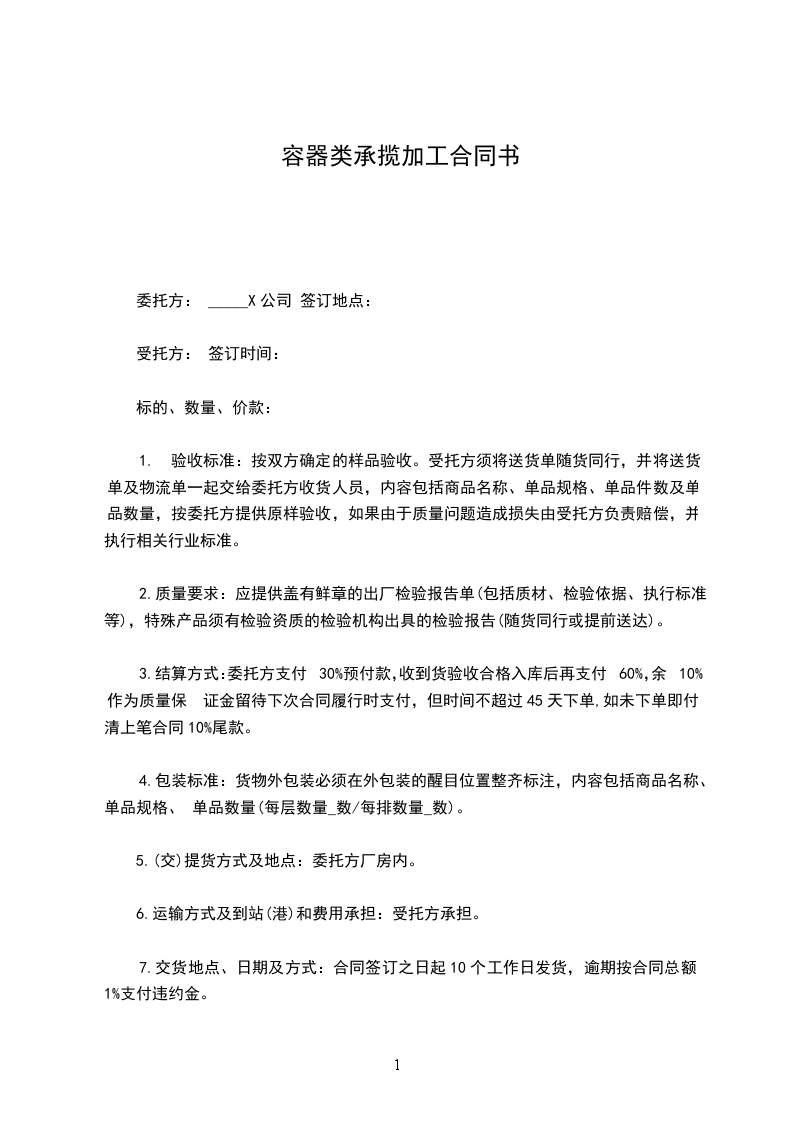 7.交货地点、日期及方式:合同签订之日起10个工作日发货,逾期按合同总额1%支付违约金。