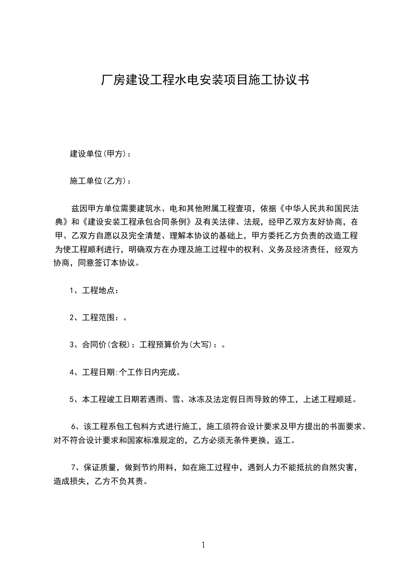 兹因甲方单位需要建筑水、电和其他附属工程壹项,依据《中华人民共和国民法典》和《建设安装工程承包合同条例》及有关法律、法规,经甲乙双方友好协商,在甲、乙双方自愿以及完全清楚、理解本协议的基础上,甲方委托乙方负责的改造工程。为使工程顺利进行,明确双方在办理及施工过程中的权利、义务及经济责任,经双方协商,同意签订本协议。