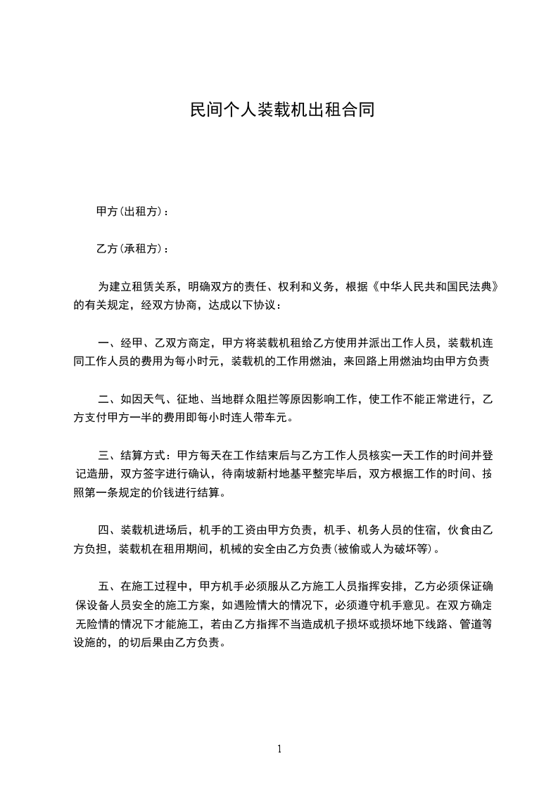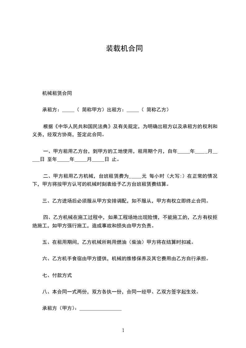 一、经甲、乙双方商定,甲方将装载机租给乙方使用并派出工作人员,装载机连同工作人员的费用为每小时元,装载机的工作用燃油,来回路上用燃油均由甲方负责。