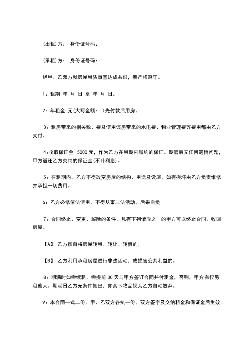 9:本合同一式二份,甲、乙双方各执一份,双方签字及交纳租金和保证金后生效。