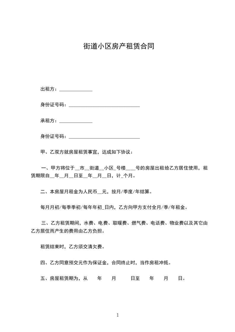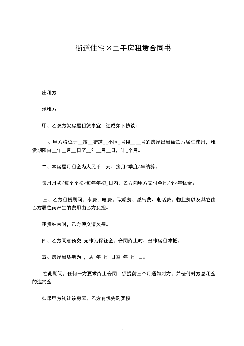 1、甲方将位于市街道小区号楼号的房屋出租给乙方居住使用,租赁期限自_____年_____月_____日至_____年_____月_____日,计_____个月。