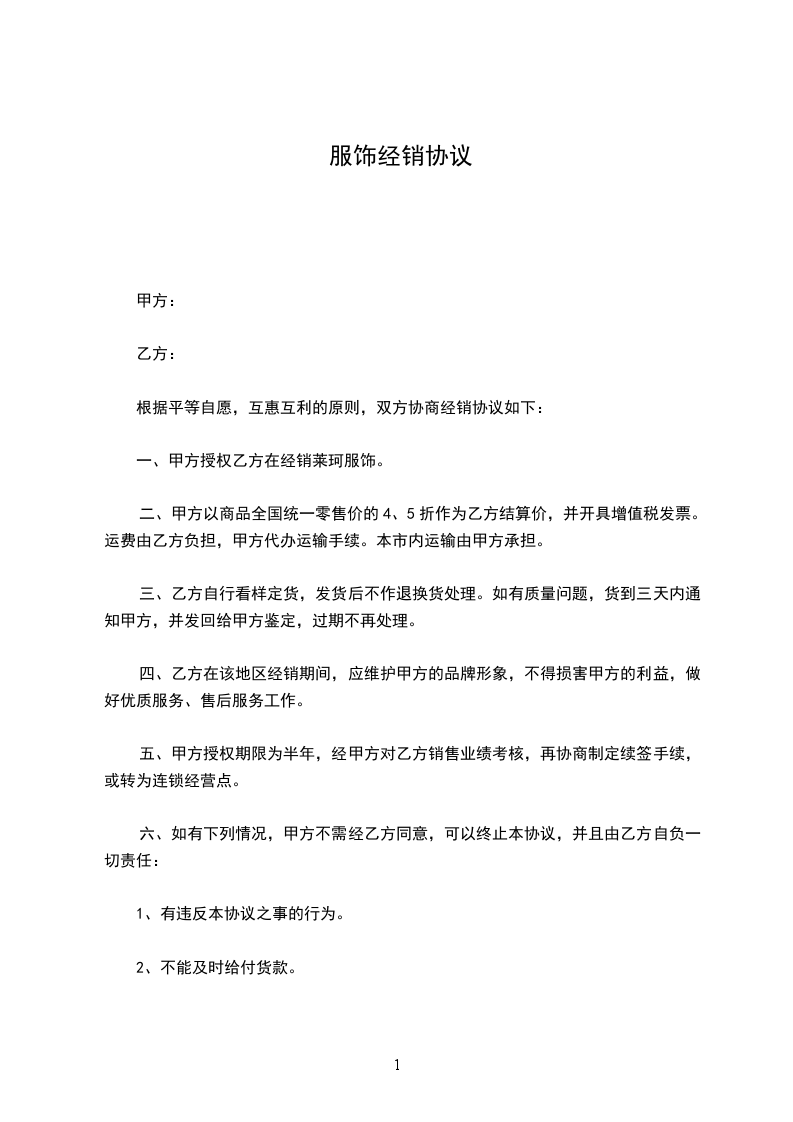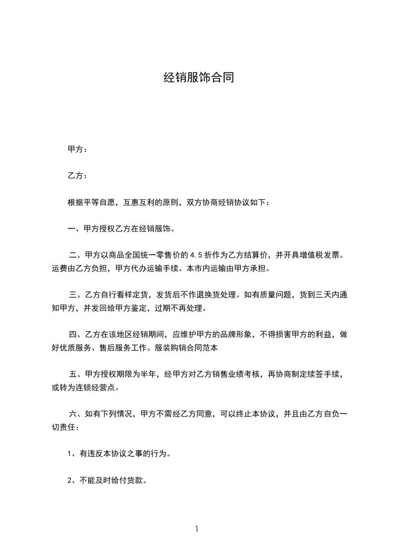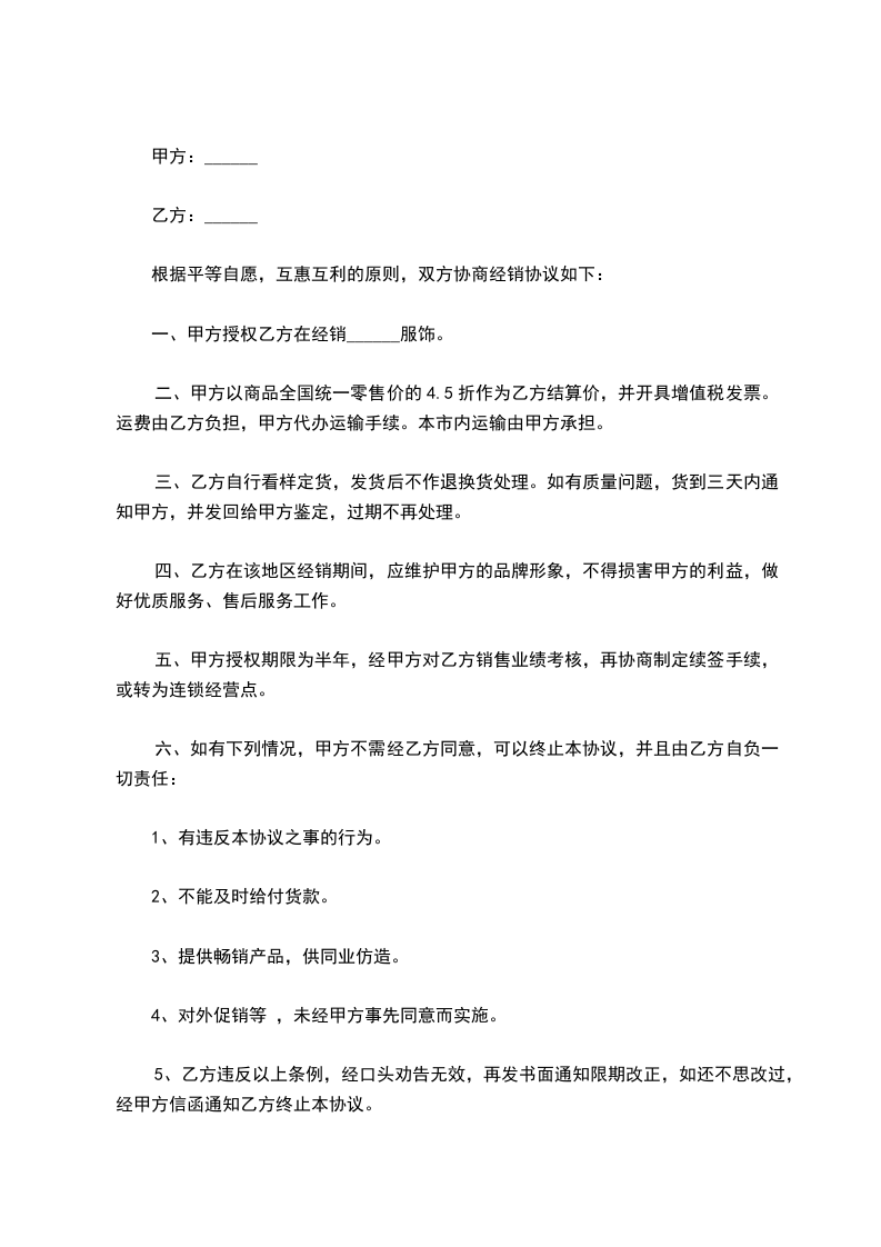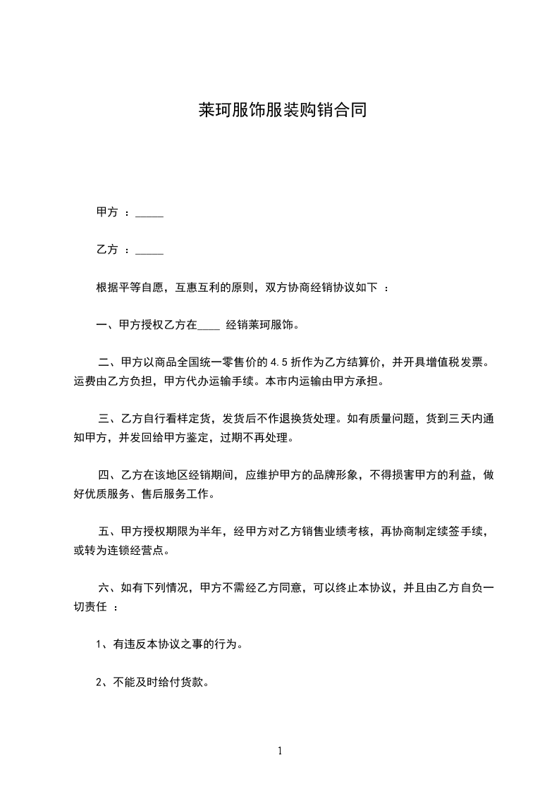 四、乙方在该地区经销期间,应维护甲方的品牌形象,不得损害甲方的利益,做好优质服务、售后服务工作。服装购销合同范文