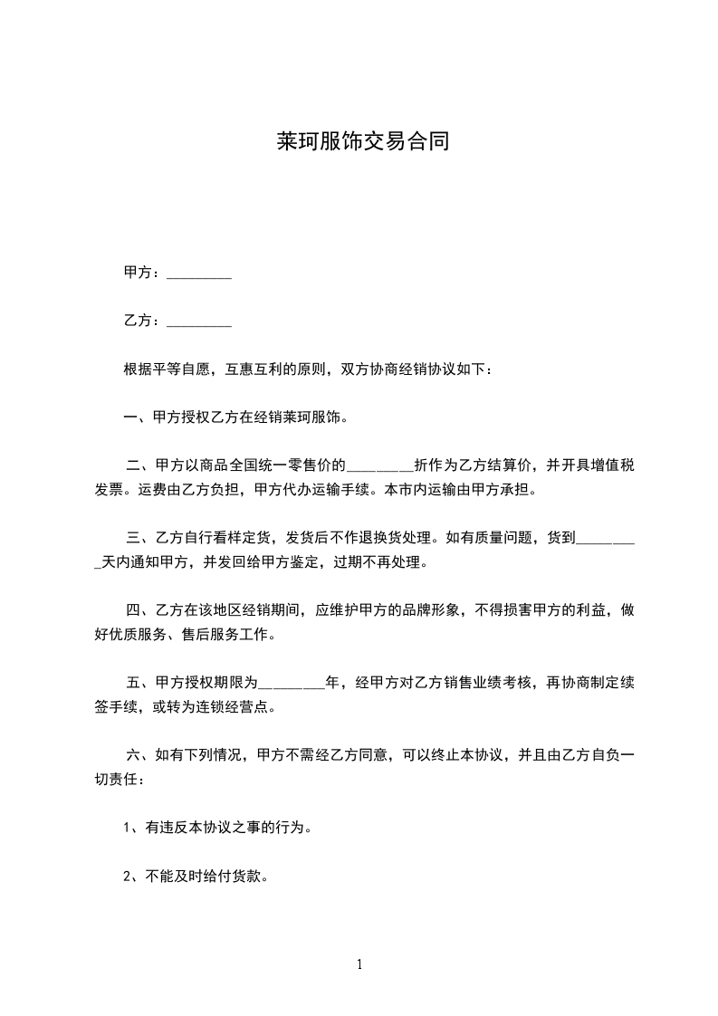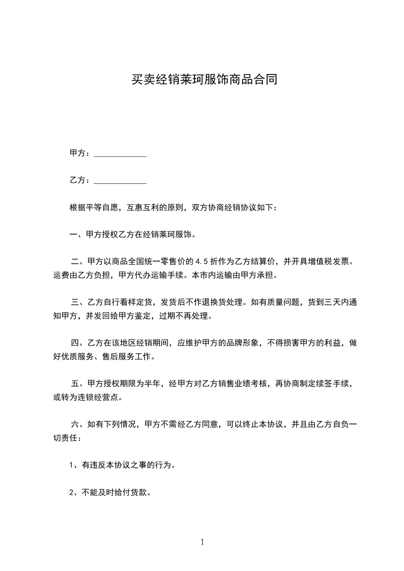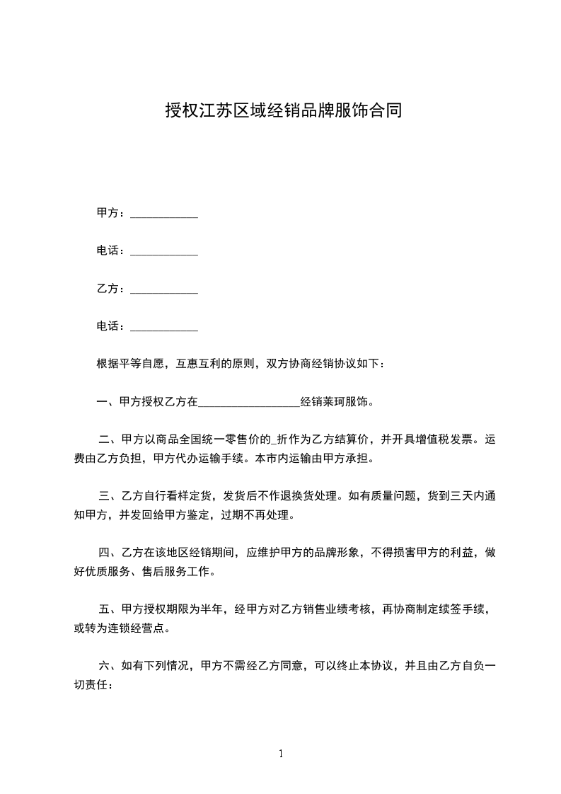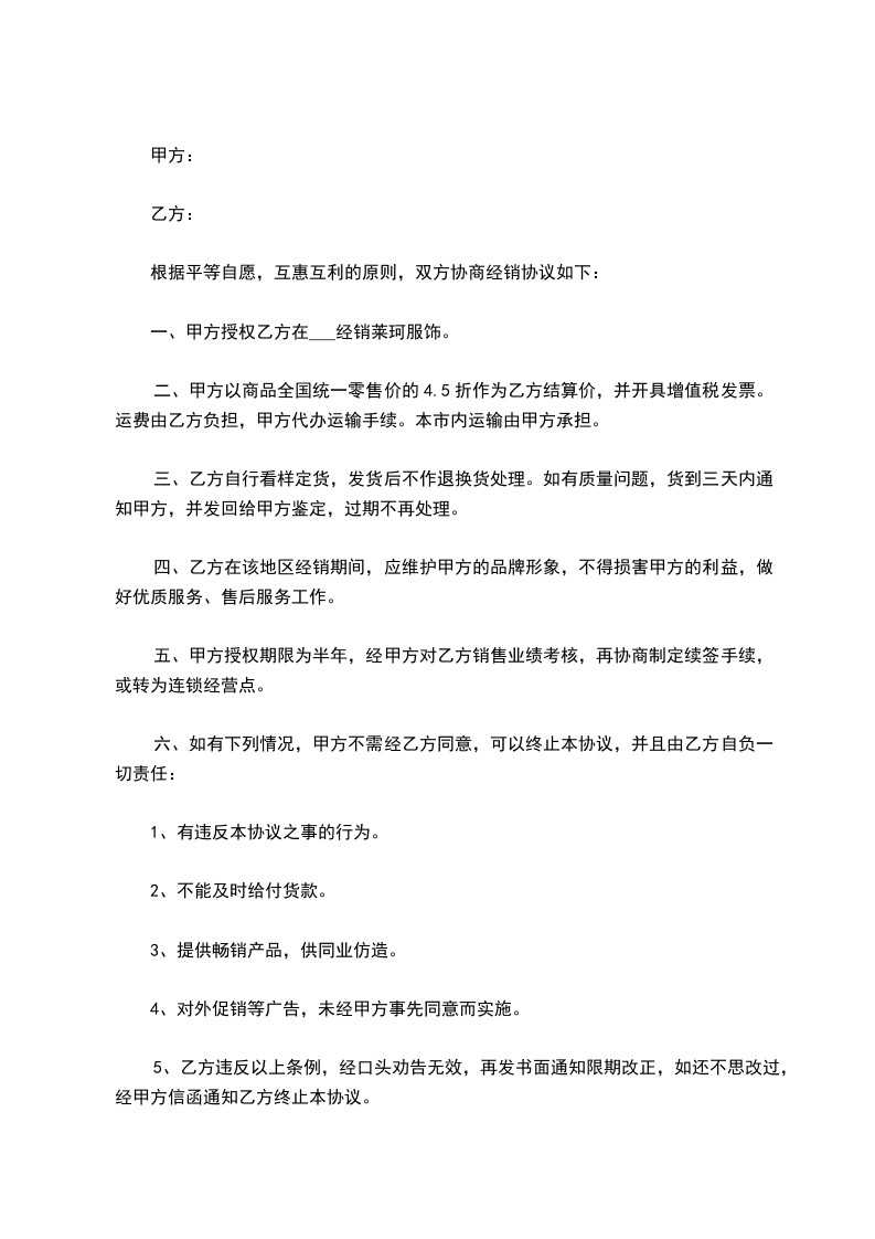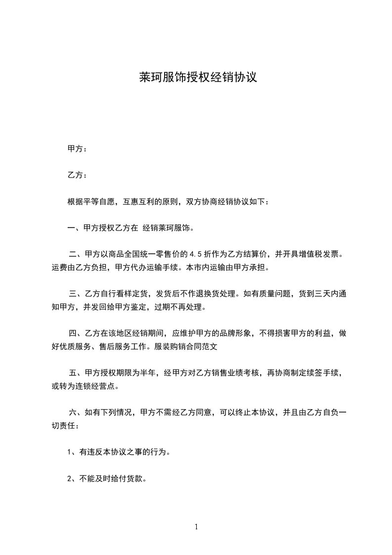 一、甲方授权乙方在 经销莱珂服饰。