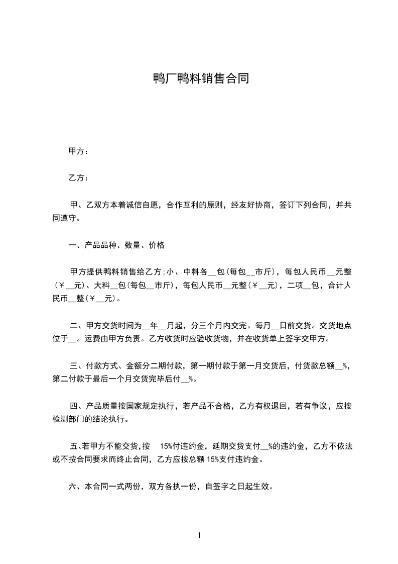 甲方提供鸭料销售给乙方;小、中料各__包(每包__市斤),每包人民币__元整(¥__元)、大料__包(每包__市斤),每包人民币__元整(¥__元),二项__包,合计人民币__整(¥__元)。