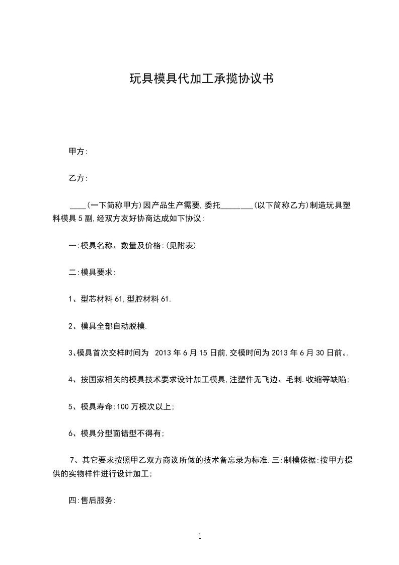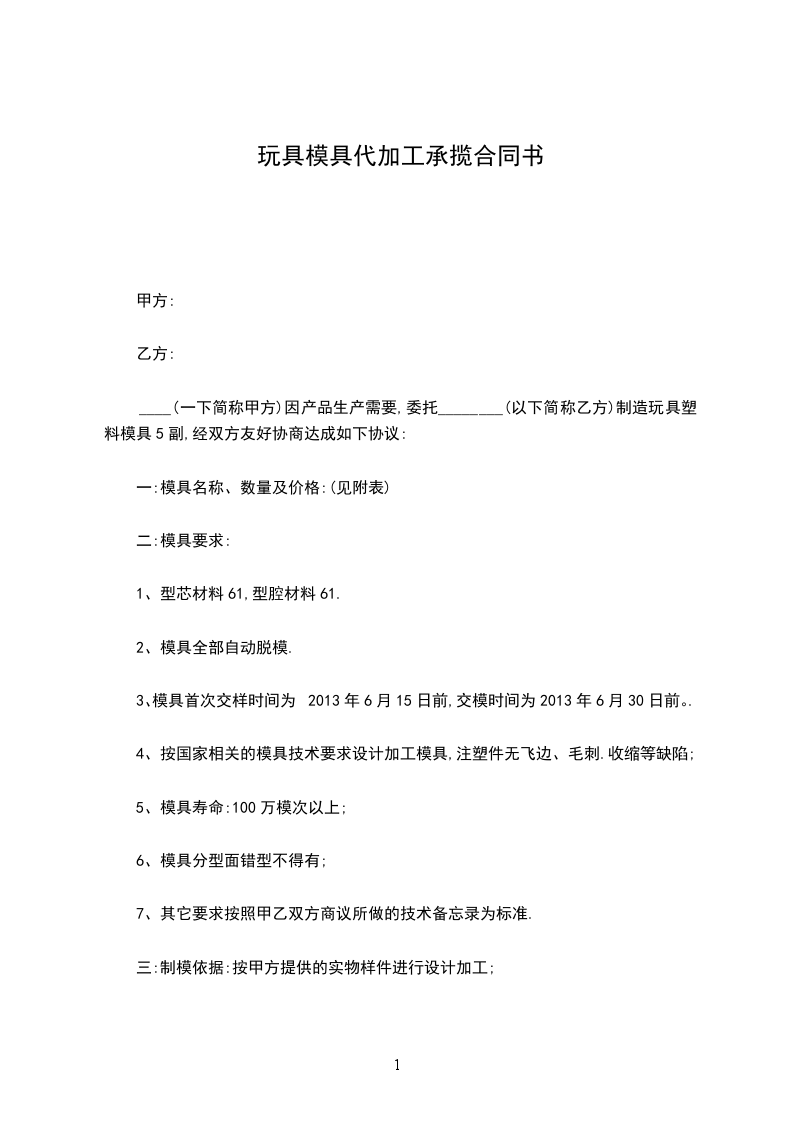 ____(一下简称甲方)因产品生产需要,委托________(以下简称乙方)制造玩具塑料模具5副,经双方友好协商达成如下协议: