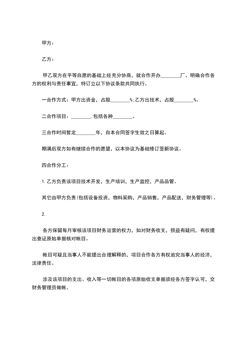 一合作方式:甲方出资金,占股________%;乙方出技术,占股________%。