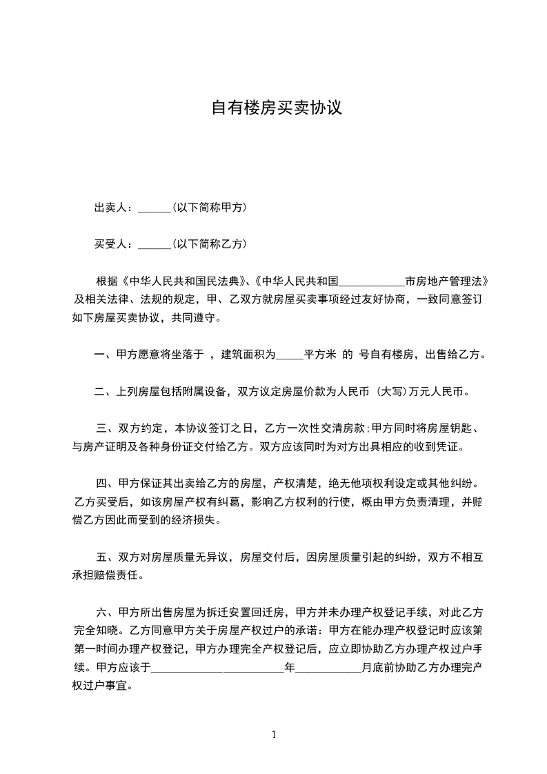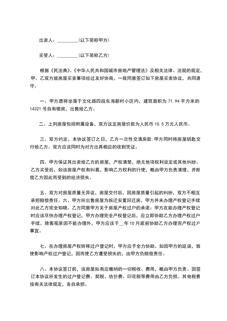 房一套(该房产未抽号分房),甲方自愿将该房产出售给乙方,乙方已对该房产相关状况做了充分了解自愿购买。甲方在本协议签订时将甲方与原卖方____签订的卖房协议等原件交付给乙方。